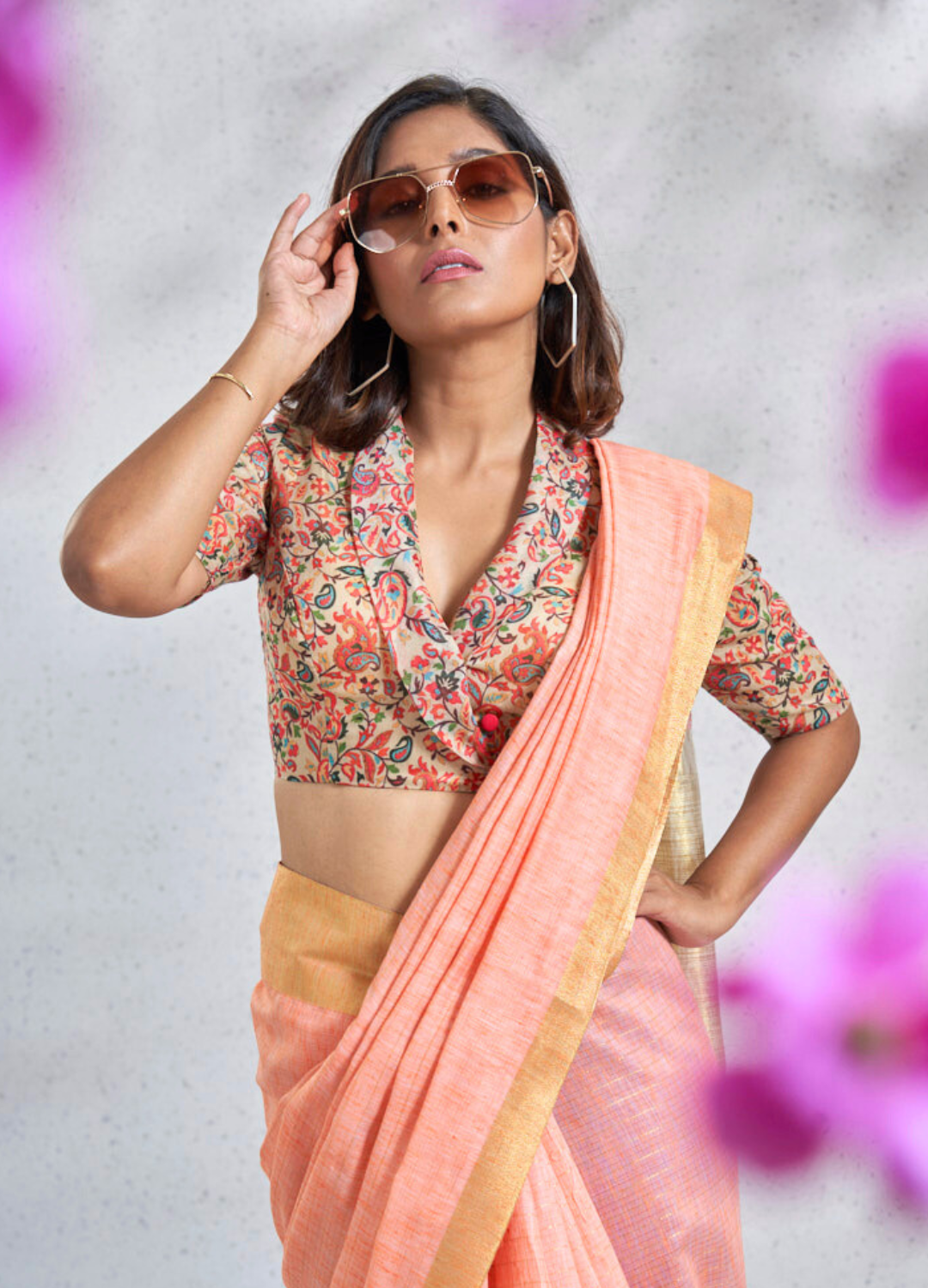 Contrast Elegance for Desk to Dinner: Transitioning from work to an evening event? Choose a cotton blouse that offers a subtle contrast to your saree. Consider pairing a solid colored saree with a striped or checkered cotton blouse for a sophisticated look. This simple tweak can instantly elevate your ensemble, making it suitable for an evening affair.