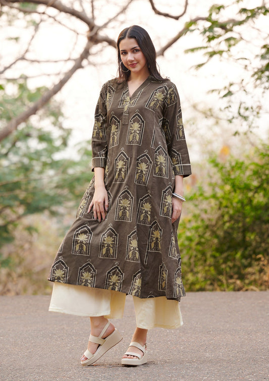Classic Brown Hand Blocked Pure Cotton Oversized A Line Kurta
