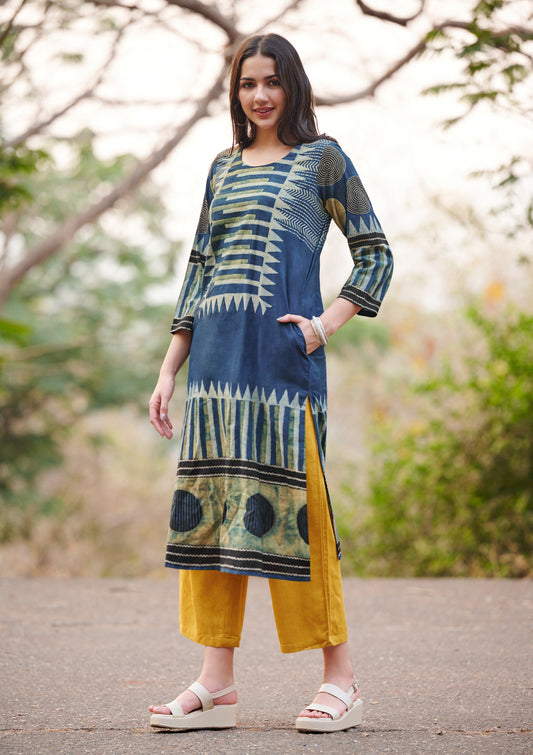 Embrace effortless elegance with Ajrakh kurtas, adorned with intricate patterns and crafted using natural dyes.