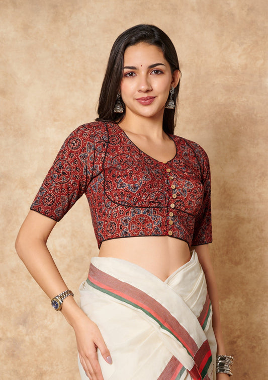 Maroon Hand Block Printed Ajrakh Pure Cotton Round Neck Readymade Blouse