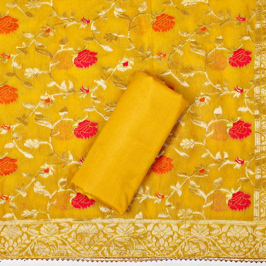 Silk Embroidered Yellow Unstitched Dress Material With Dupatta