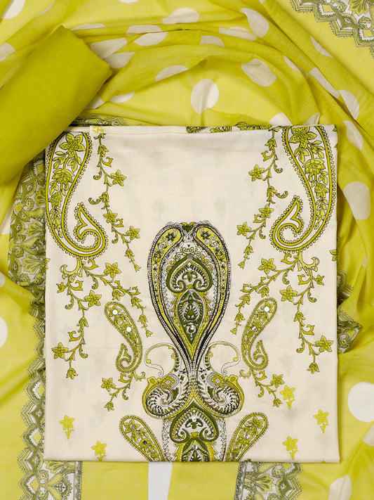 Cotton Printed Embellished Cream-Green Unstitched Dress Material