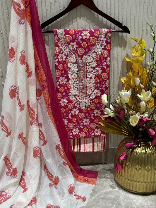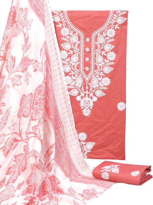 Cotton Embroidered Pink Floral Unstitched Dress Material With Dupatta