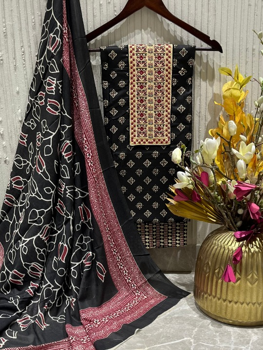 Cotton Embroidered Black Unstitched Dress Material With Dupatta