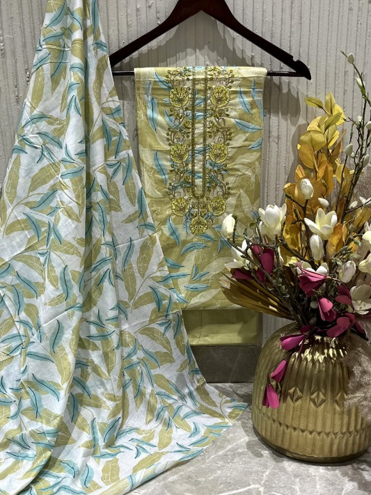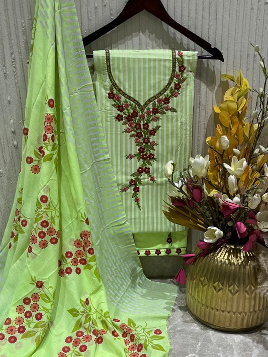 Cotton Embroidered Green Unstitched Salwar Dress Material With Dupatta