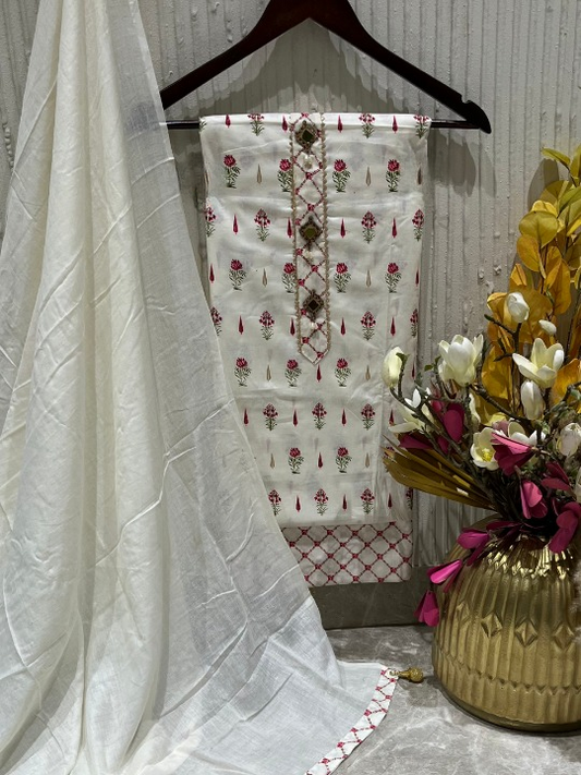 Cotton Embroidered Off White Unstitched Dress Material With Dupatta