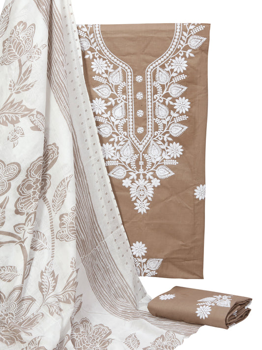 Cotton Embroidered Beige Unstitched Dress Material With Dupatta