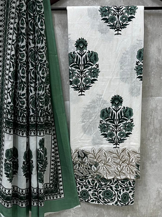 Cotton Printed White & Green Unstitched Dress Material With Dupatta