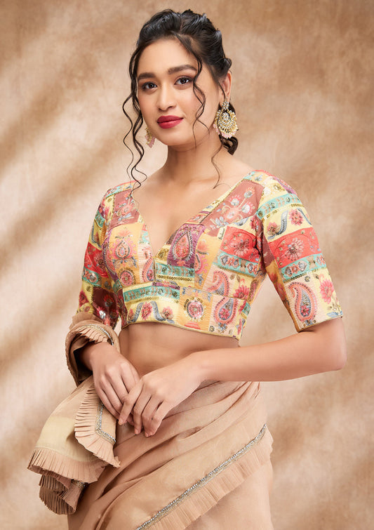 Gold & Beige Brocade Sweetheart Neck Readymade Blouse