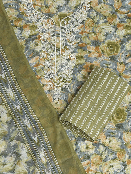 Cotton Embroidered Olive Green Unstitched Dress Material