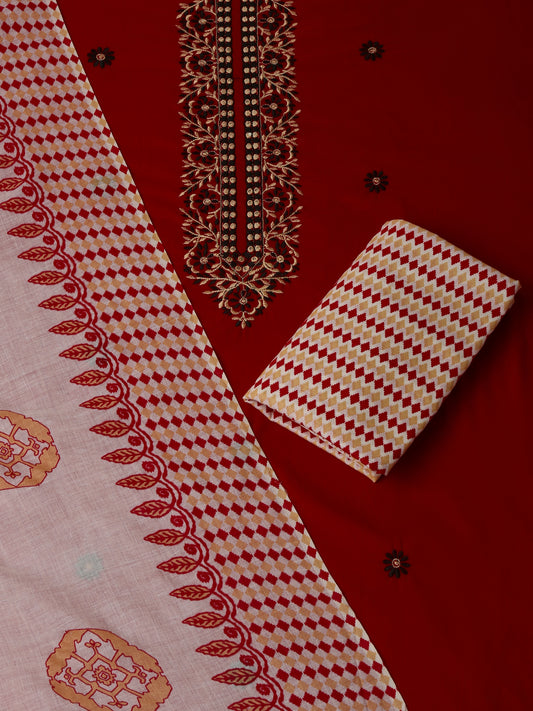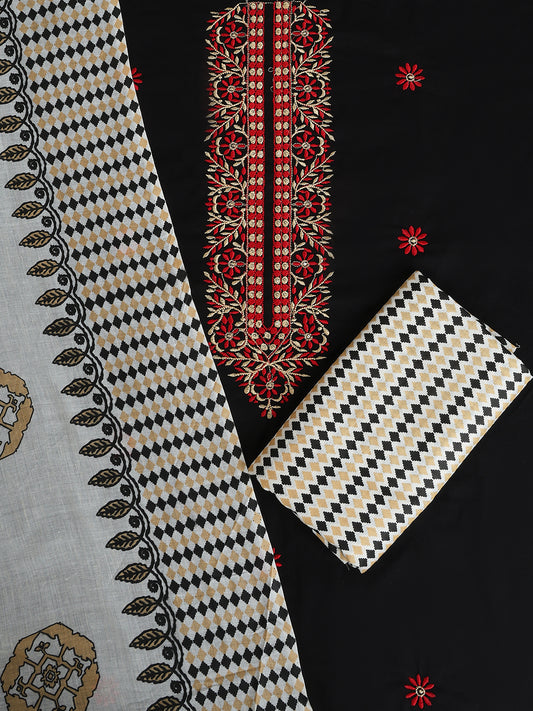 Cotton Embroidered Black & Red Unstitched Dress Material