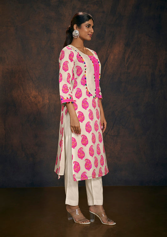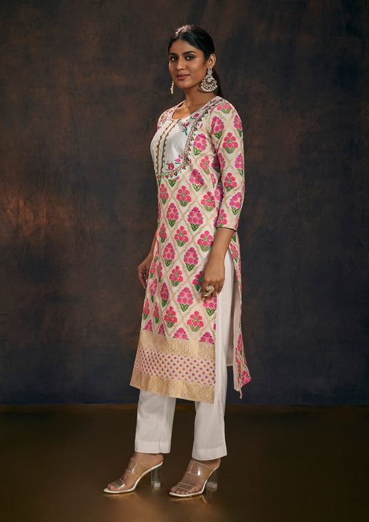 Off White Pink Banarasi Chanderi Cotton Kurta & Dupatta