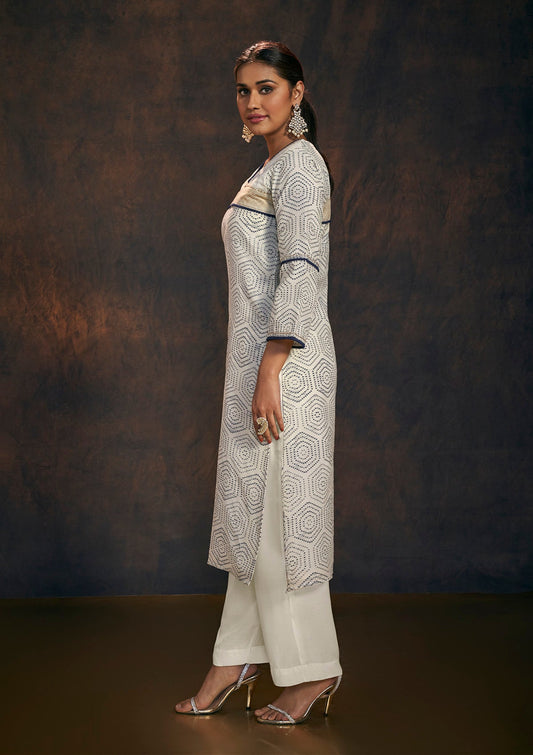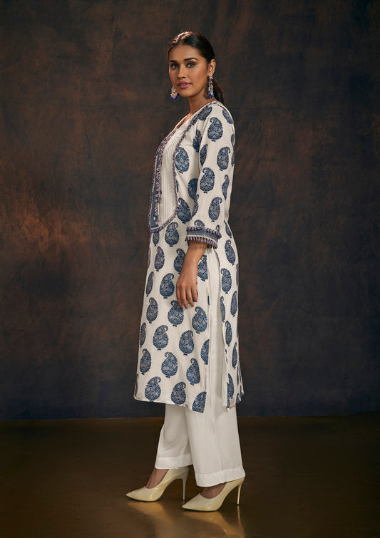 Off white & Blue Banarasi Chanderi Cotton Kurta & Dupatta