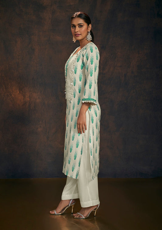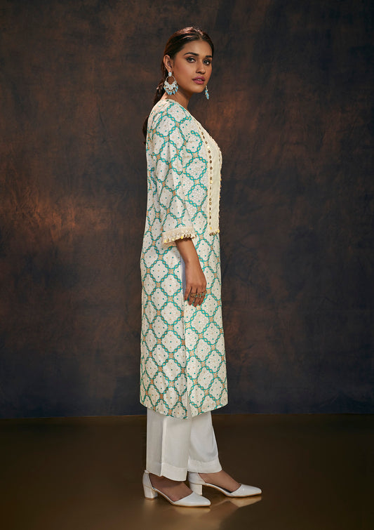 Cream And Turquoise Banarasi Chanderi Silk Kurta & Dupatta