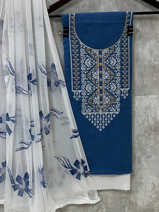 Cotton Denim Embroidered Blue & White Unstitched Dress Material With Dupatta