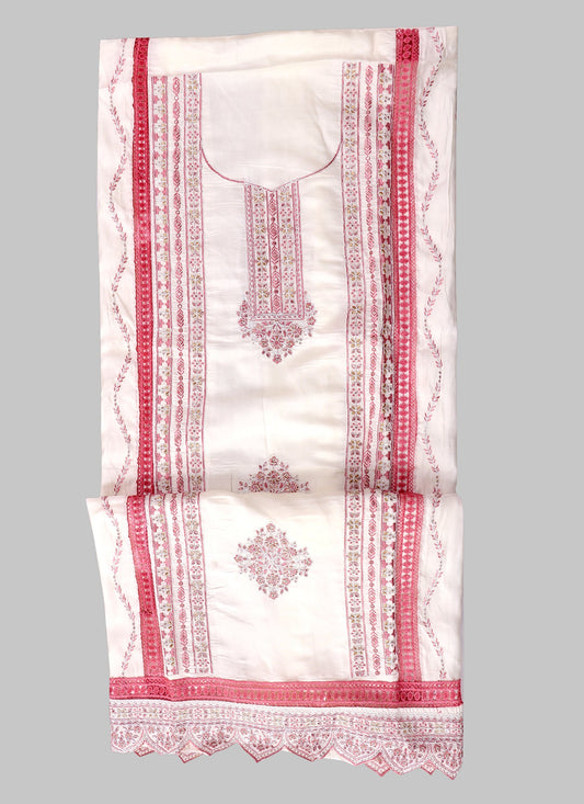Silk Embroidered Pink & White Unstitched Dress Material With Dupatta