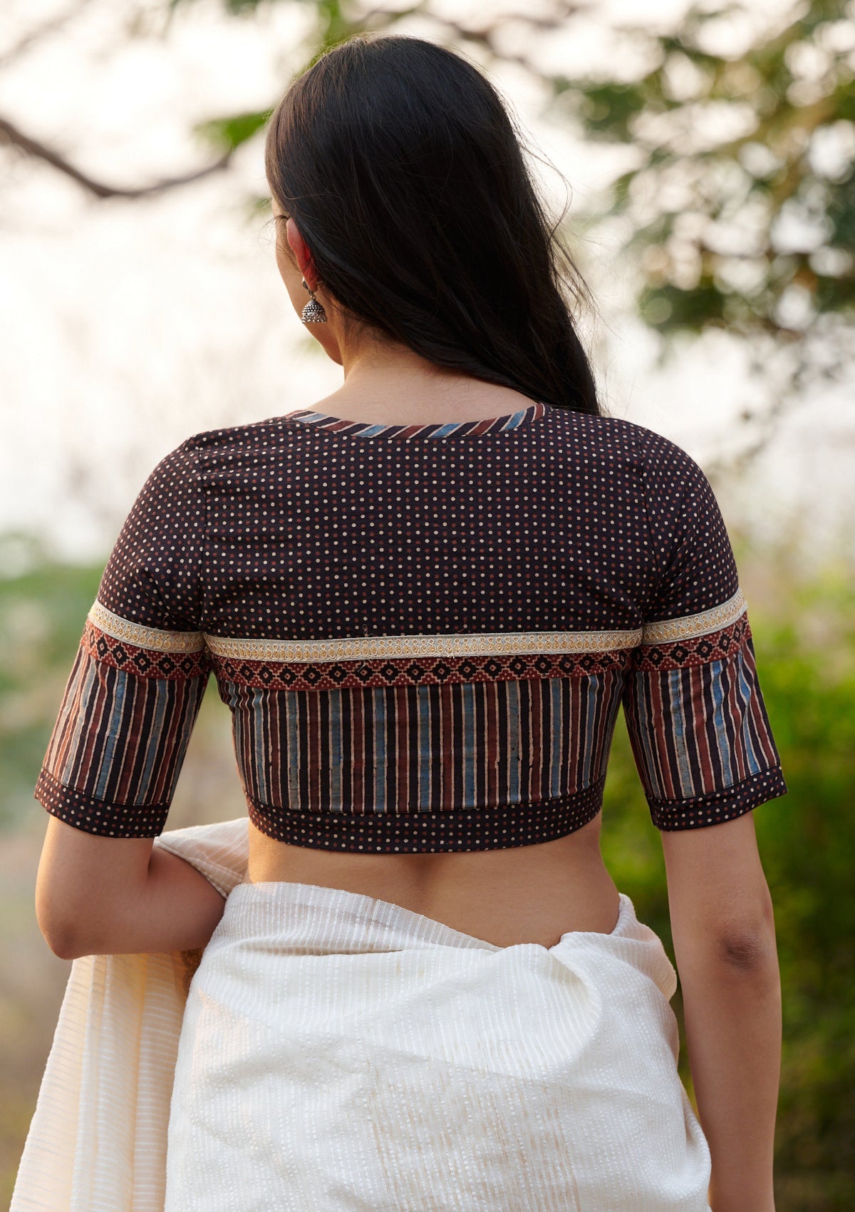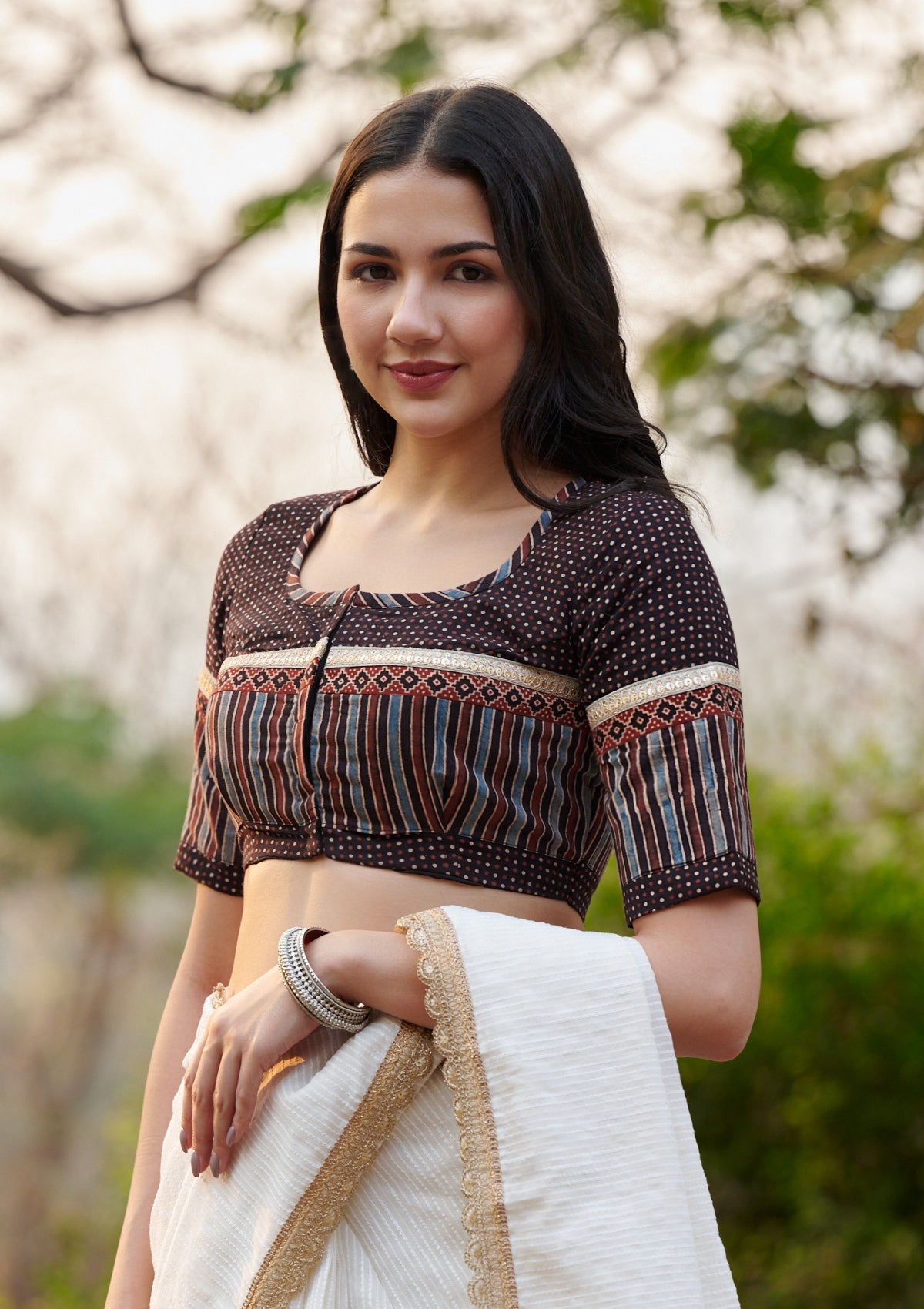 Description - A beautifully crafted pure cotton Ajrakh blouse featuring a mix of polka dots, geometric motifs, and striped patterns in natural dyed colours. The blouse has a round neckline and front hook closure, enhanced with intricate golden lace along the bust line and sleeves for a subtle shimmer. The elbow-length sleeves carry a combination of prints, making it a unique and elegant choice for ethnic wear.