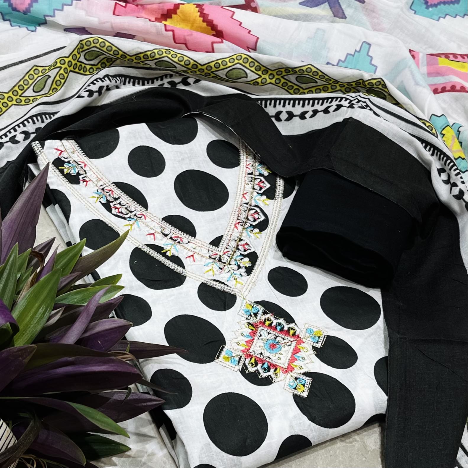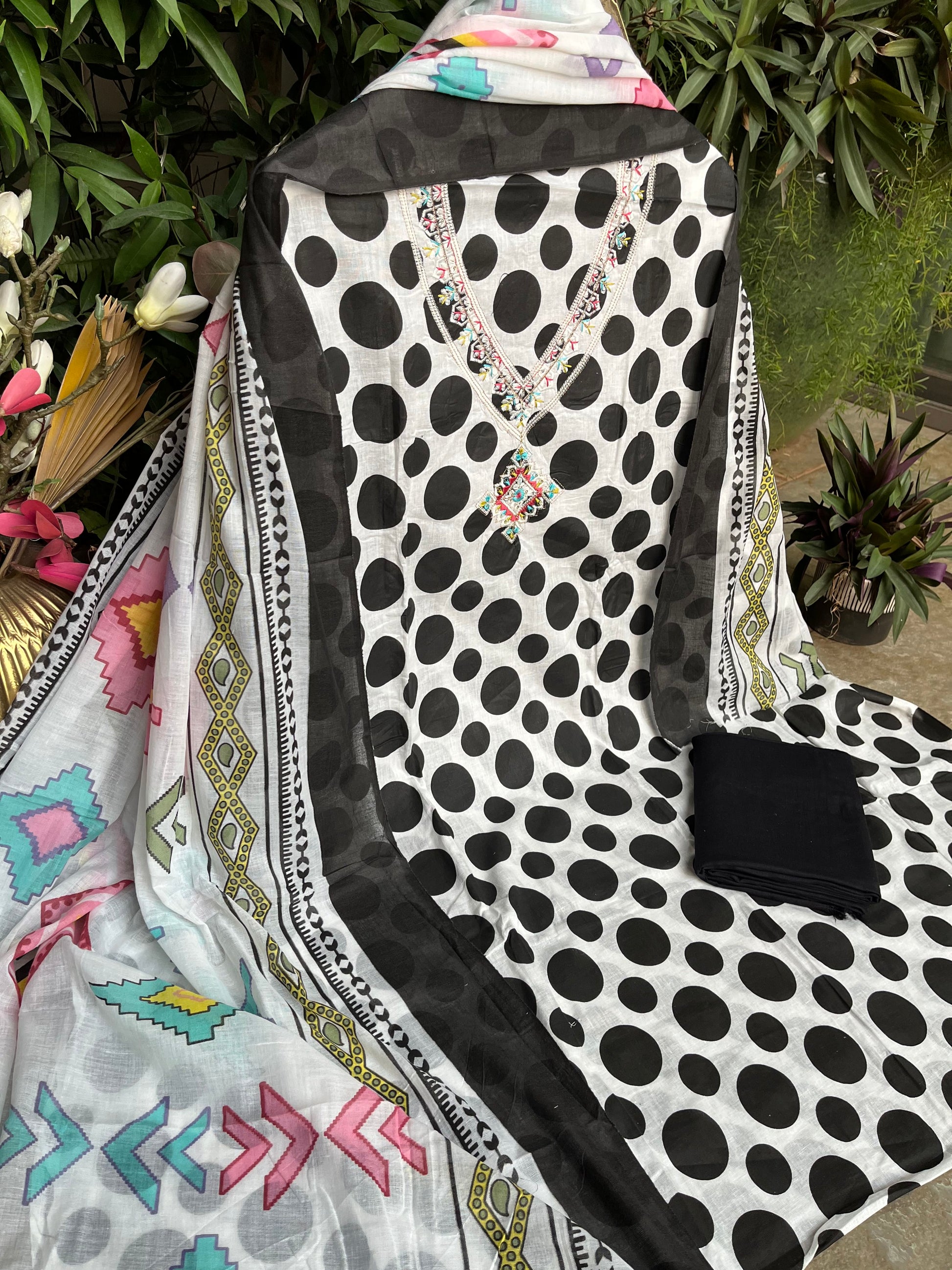 Description : Add a timeless charm to your ethnic wardrobe with this black and white polka dot printed cotton unstitched dress material, Crafted from soft, breathable cotton fabric, the kurta features classic polka dot prints beautifully enhanced with intricate embroidery at the neckline. The set is paired with a solid colour bottom, along with a stylish printed dupatta that completes the look with a touch of flair. Being unstitched, it allows you to tailor the outfit to your preferred fit and silhouette.