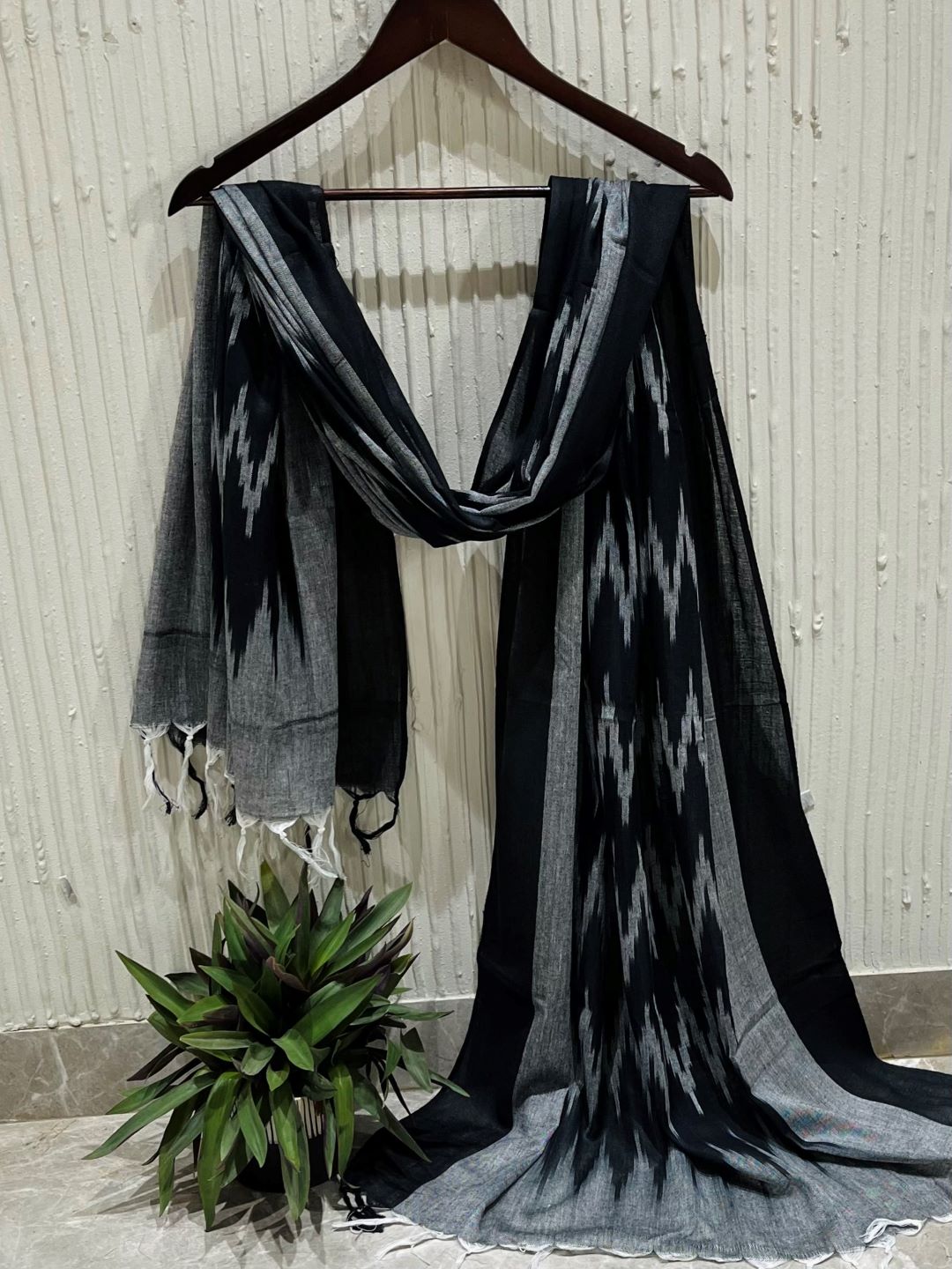 Description : Black and Grey ikat-inspired dupatta with subtle woven patterns and soft tassel detailing. Lightweight and breathable fabric for an elegant everyday ethnic look.