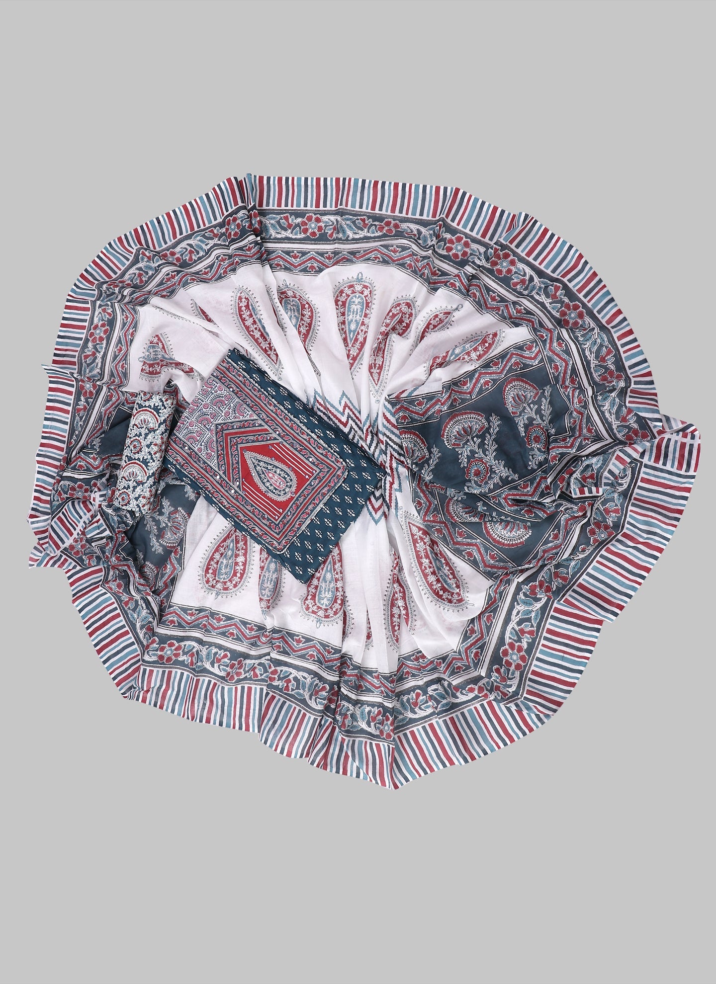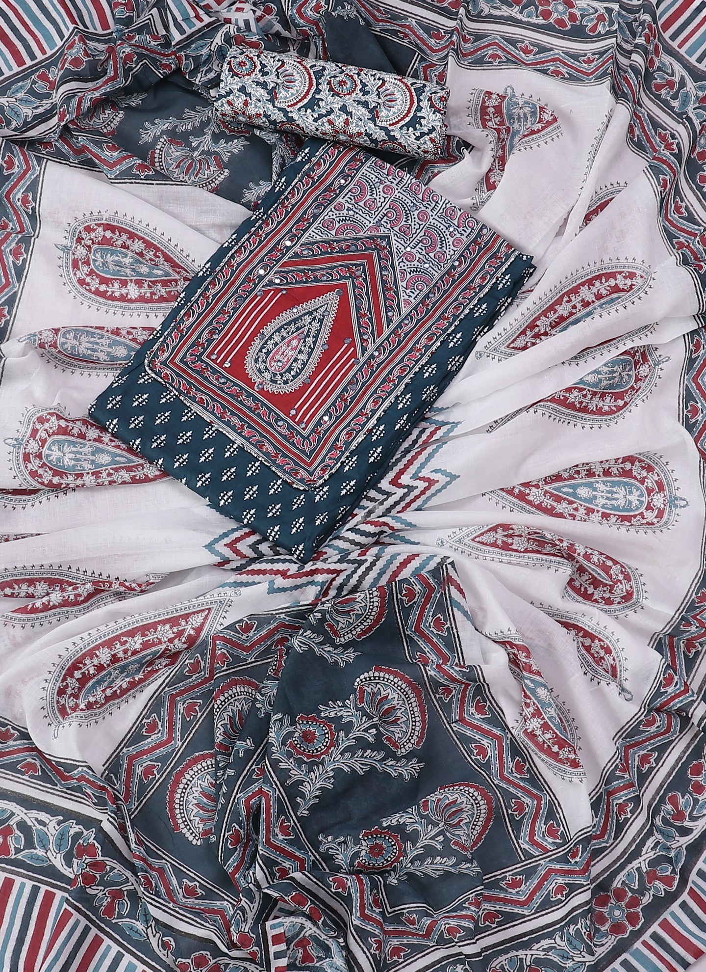 Details: This elegant blue and white unstitched dress material set includes a top, bottom, and dupatta, perfect for creating a stylish outfit tailored to your preferences. It features a beautiful block print design with a touch of mirror work at the yoke. Crafted from high-quality cotton fabric which is comfortable for all seasons.