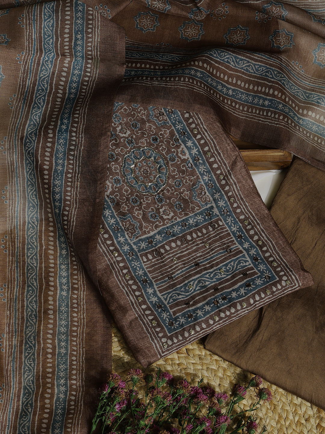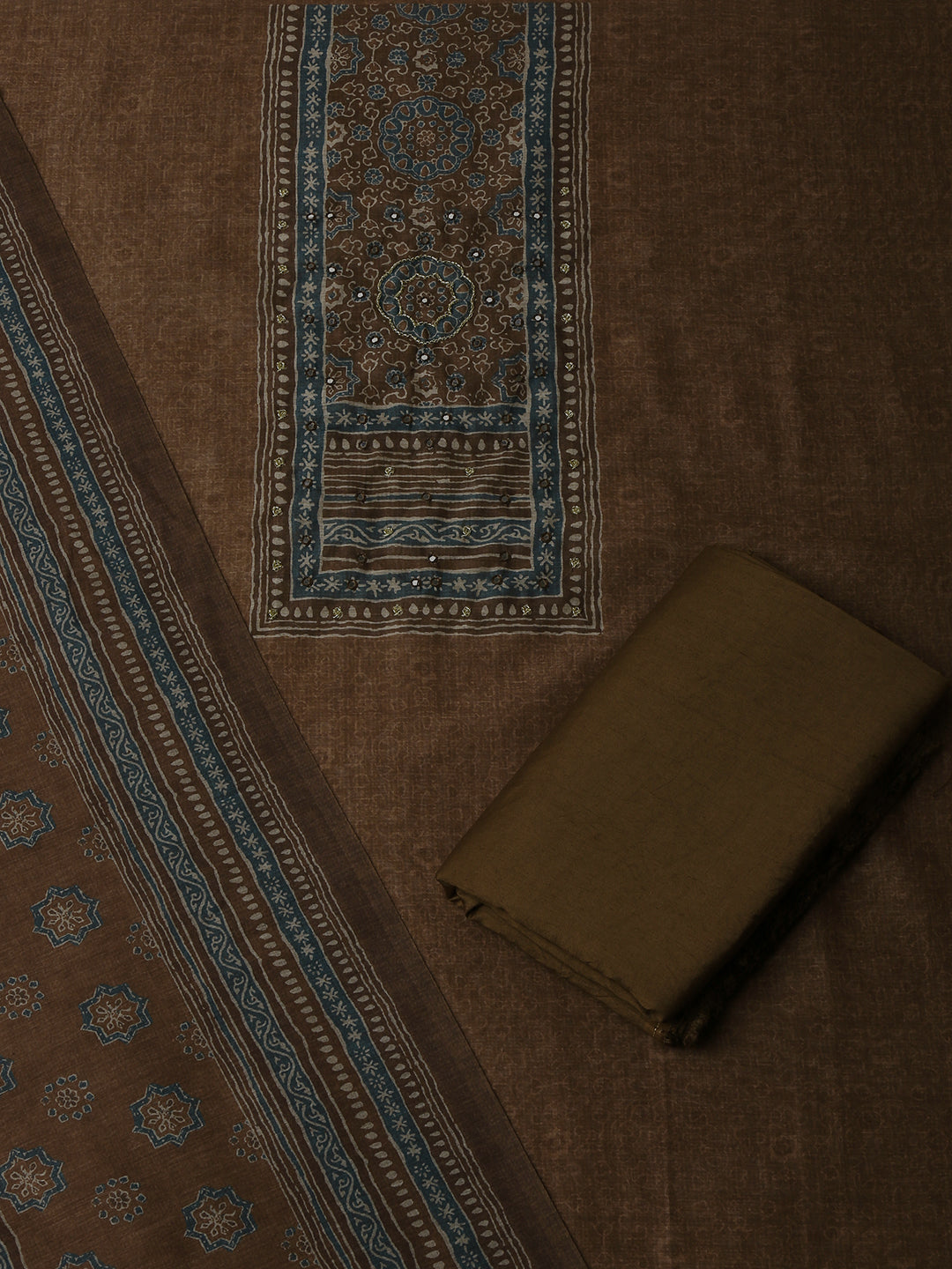 Brown Chanderi Silk Embellished Unstitched Dress Material (3 Pc)