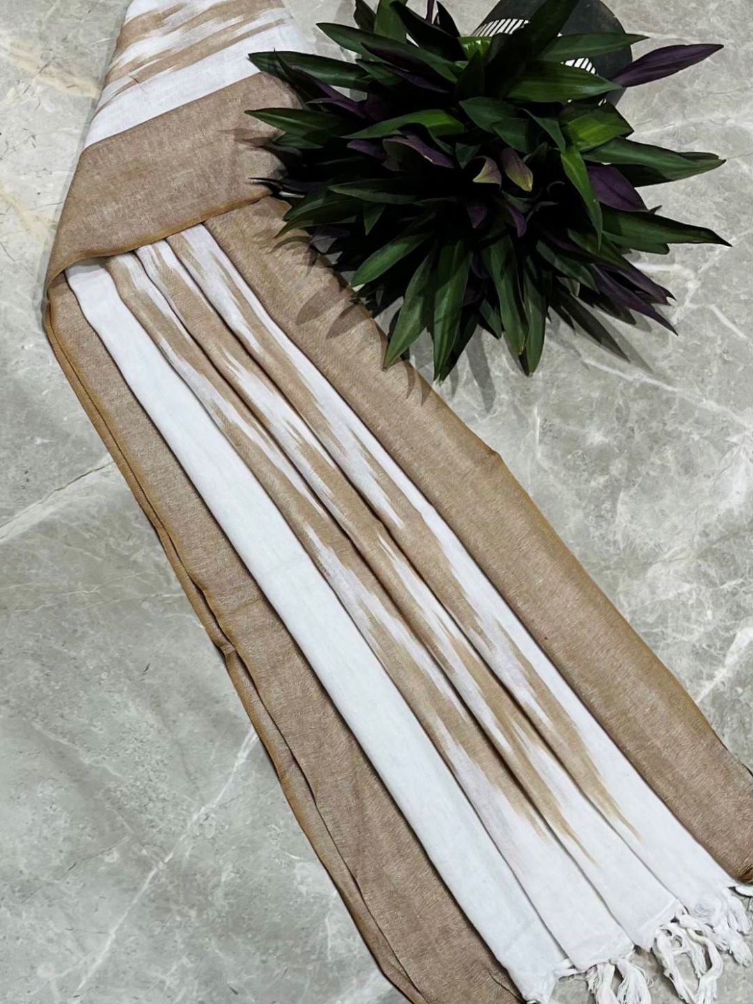 Description : Brown and off-white ikat-inspired dupatta with subtle woven patterns and soft tassel detailing. Lightweight and breathable fabric for an elegant everyday ethnic look.