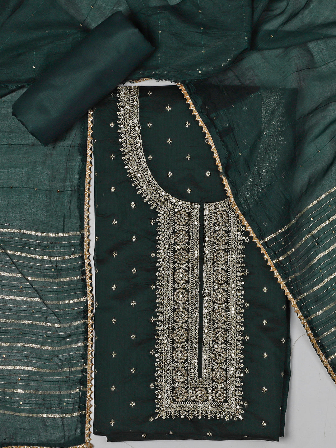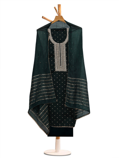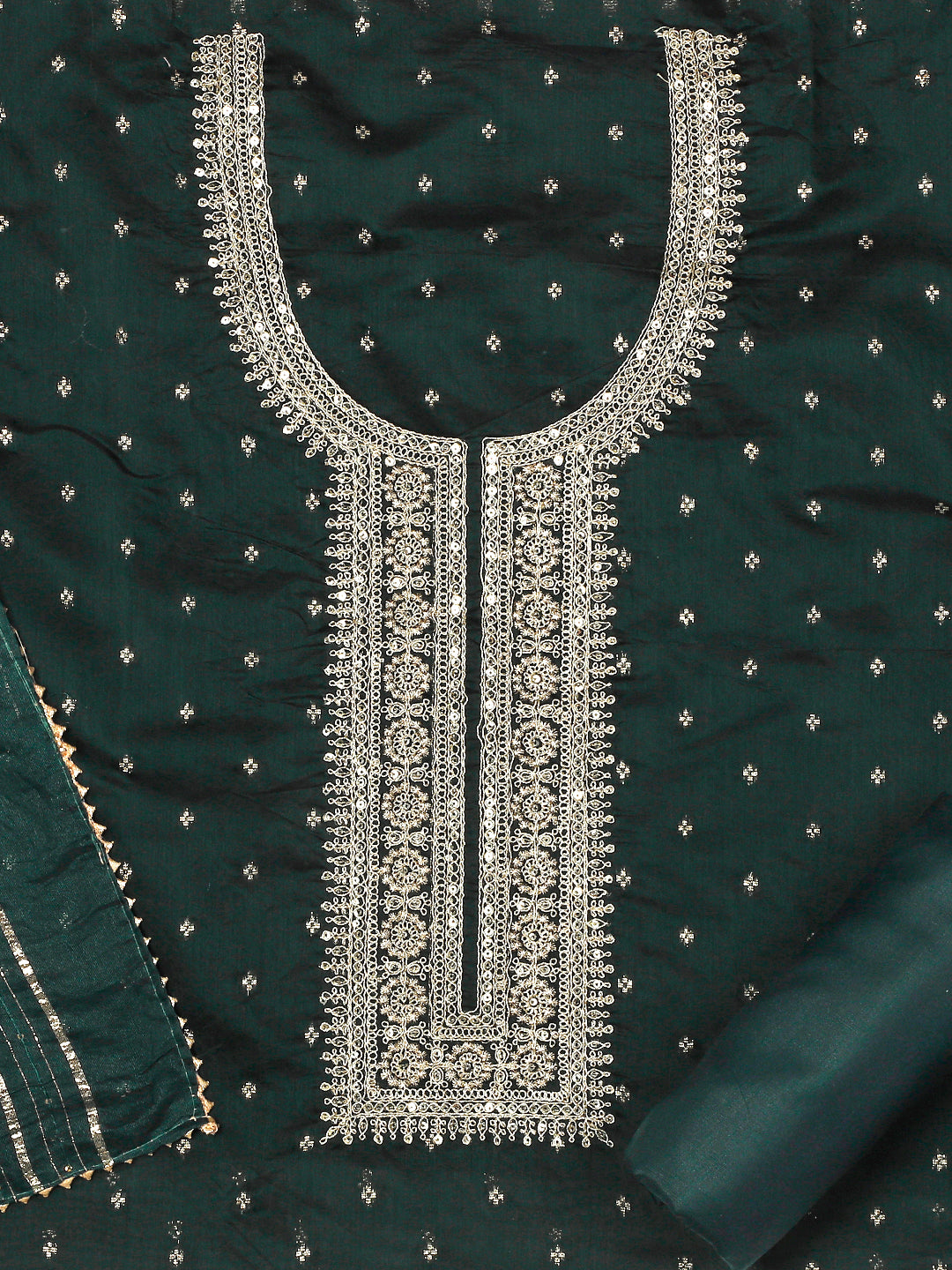Description : This Chanderi Embroidered Unstitched Dress Material features woven golden buttis all over, adding a touch of shimmering elegance to the fabric. The soft, lightweight Chanderi fabric is beautifully adorned with intricate embroidery, creating a perfect balance of tradition and sophistication. Ideal for weddings, festive celebrations, or special occasions, this unstitched material offers you the freedom to craft a custom ensemble that shines with luxury and style.