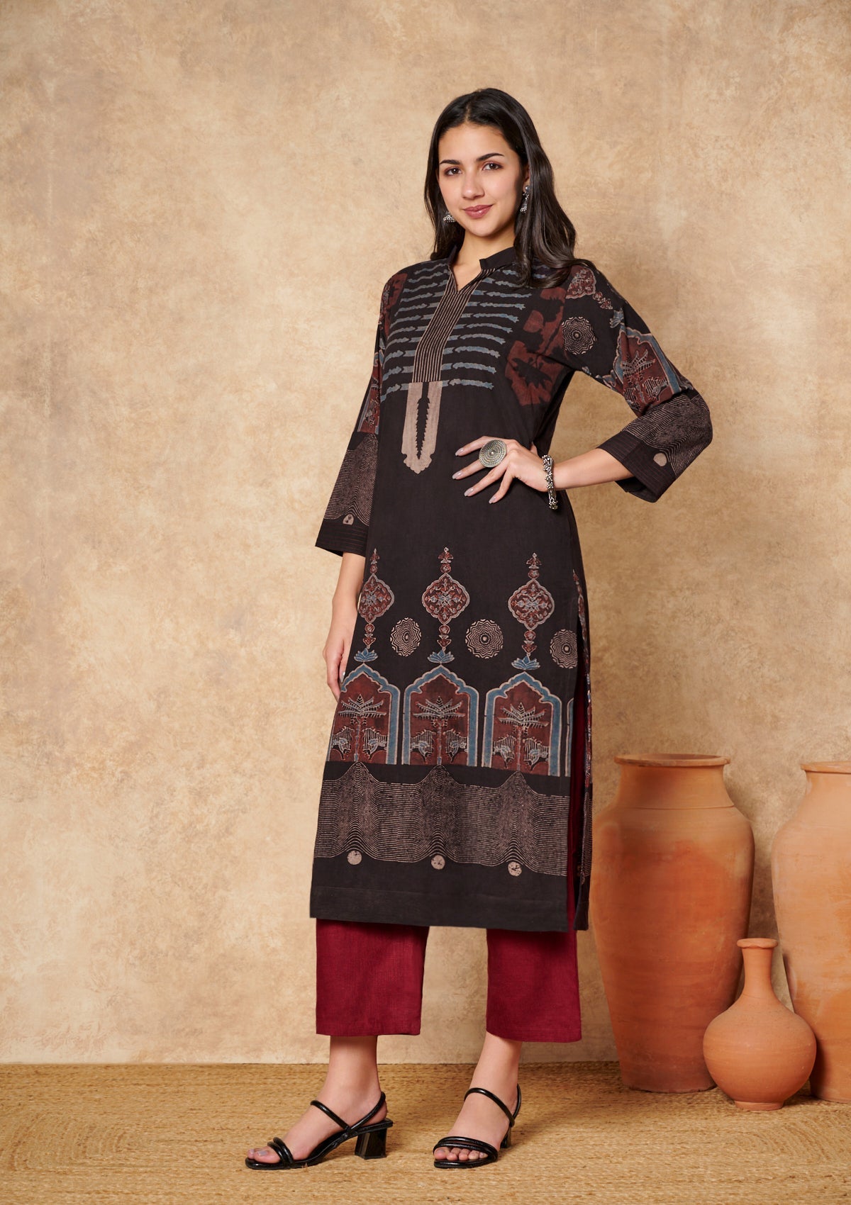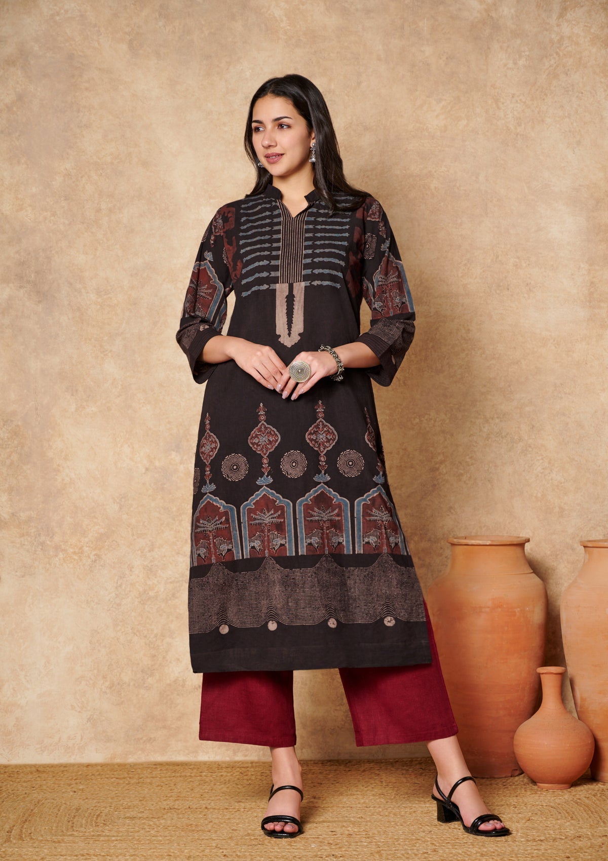 Description : Elevate your ethnic wardrobe with this stunning natural-dyed Ajrakh kurti, crafted from breathable and sustainable pure cotton. The rich earthy black base is beautifully complemented by intricate geometric and striped Ajrakh detailing in shades of blue and beige. Featuring a stylish mandarin collar, three-quarter sleeves with running stitch on the hem line, and a relaxed silhouette, this kurti offers both comfort and elegance. Perfect for festive gatherings, casual outings, and cultural events, pair it with matching pants and statement accessories for a timeless appeal.