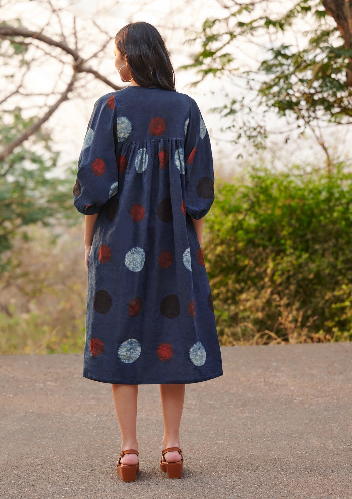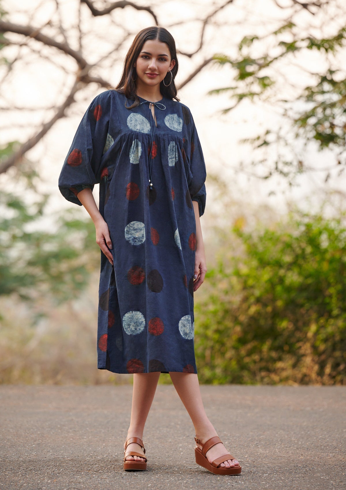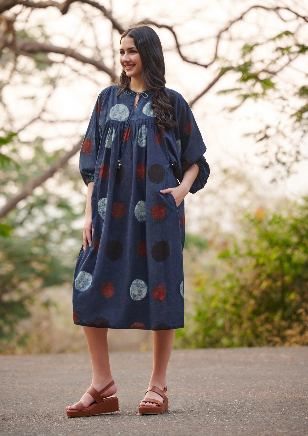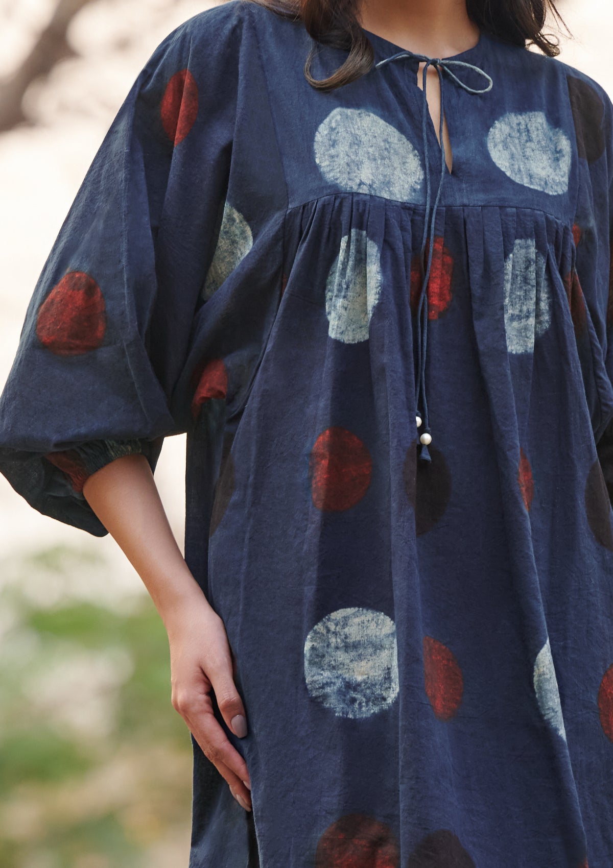 Description: Embrace heritage craftsmanship with this stunning Ajrakh indigo dress, adorned with intricate hand-block patterns. Designed for effortless elegance, this flowy silhouette offers both comfort and style. The gathered yoke adds subtle texture, while the tie-up neckline with tassel details enhances its bohemian charm. Three-quarter puff sleeves with elastic cuffs provide a structured yet airy feel, while pleats over the bustline and back add a refined touch. Thoughtfully crafted with side pockets for added convenience, this dress is a perfect blend of tradition and modern ease.