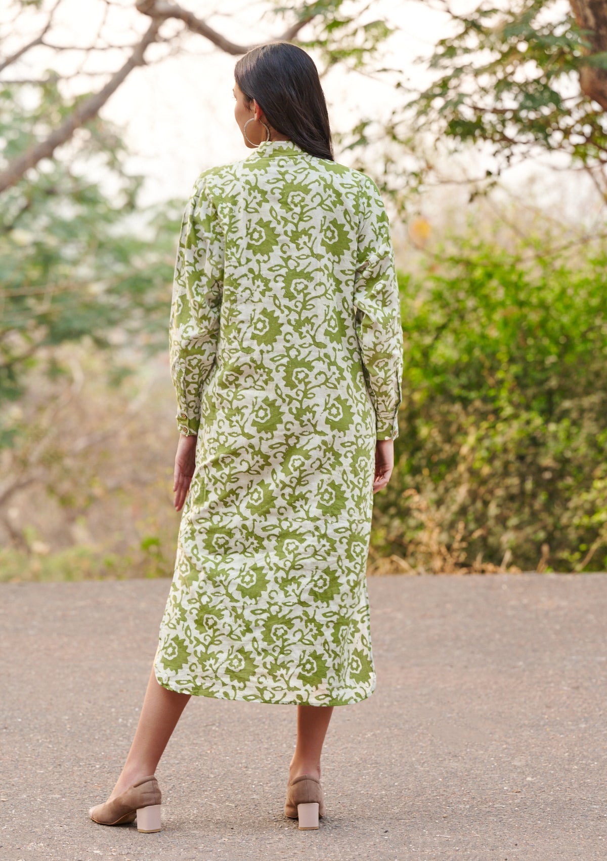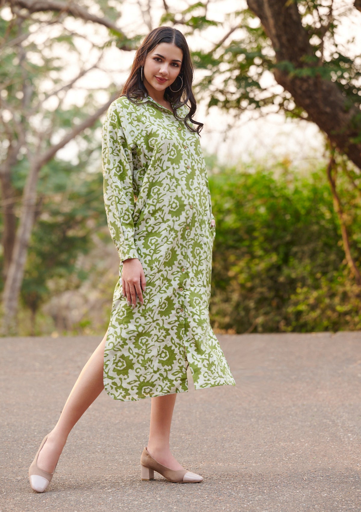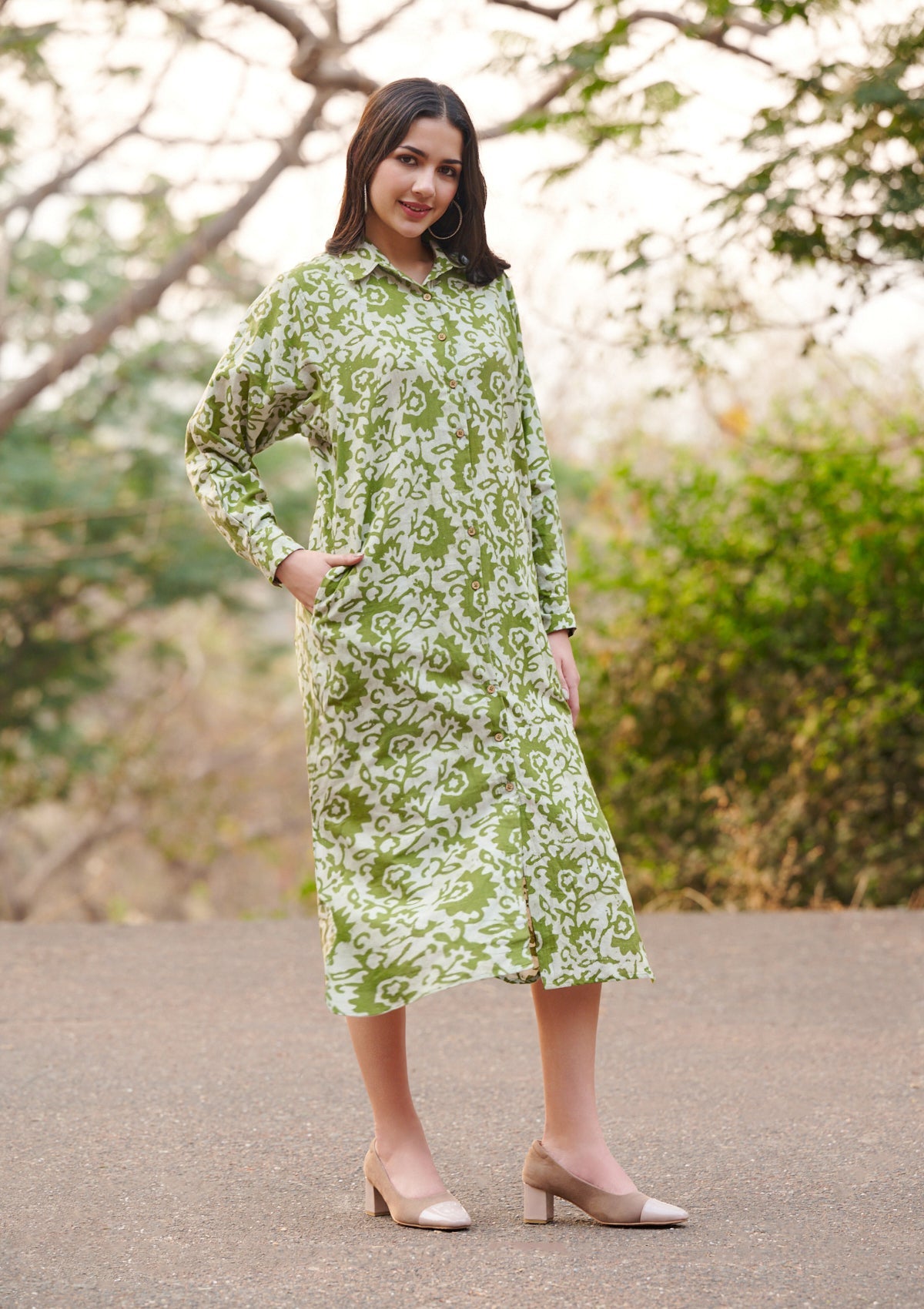 Description : This elegant green and white printed shirt dress combines comfort with a chic, modern aesthetic. The long sleeves and collared neckline add a structured, sophisticated touch, while the subtle side slits enhance ease of movement. The dress features a relaxed fit with functional pockets, making it perfect for both casual outings and workwear. This outfit exudes effortless grace and versatility. Ideal for those who love a minimal yet stylish look!
