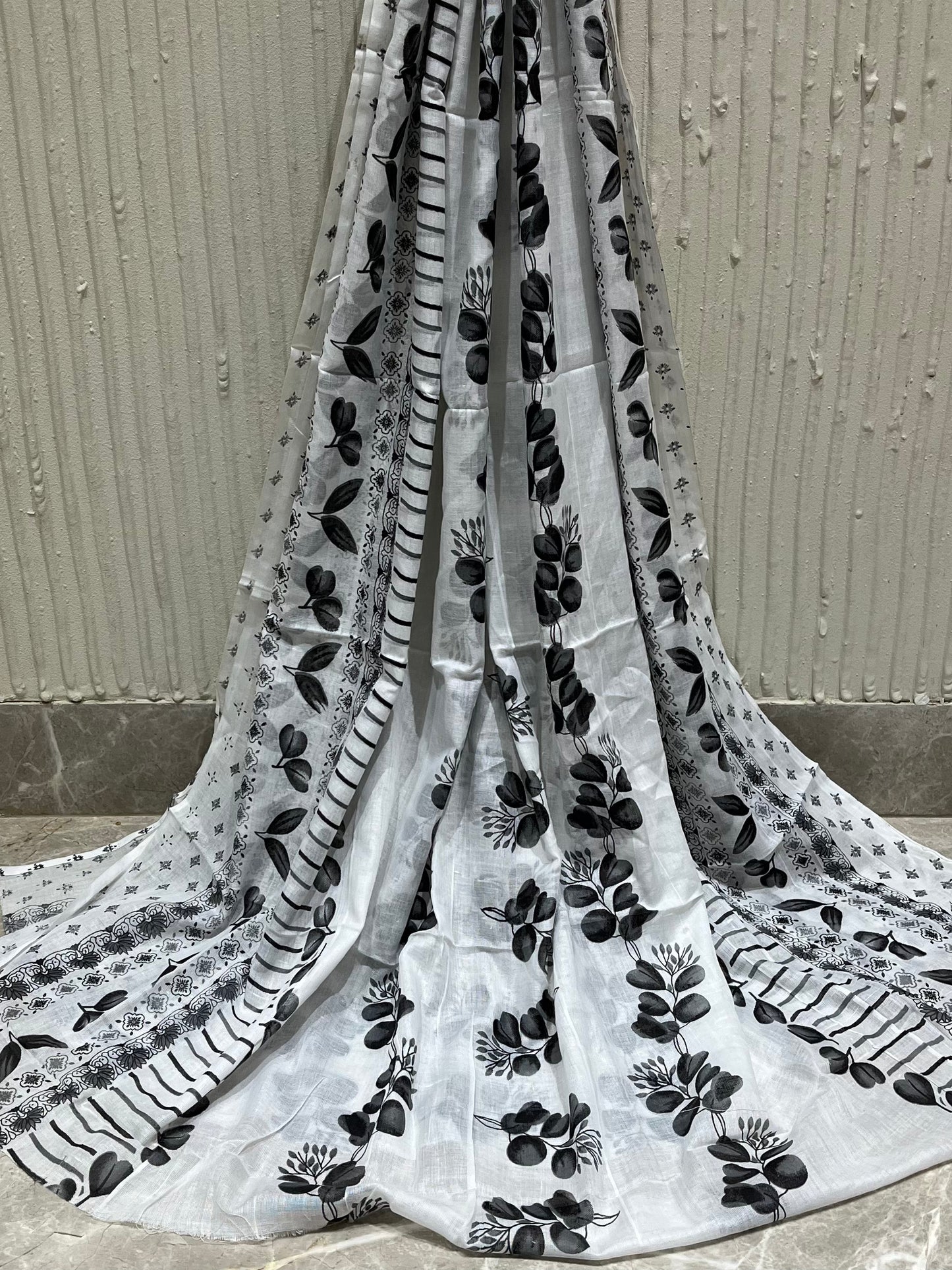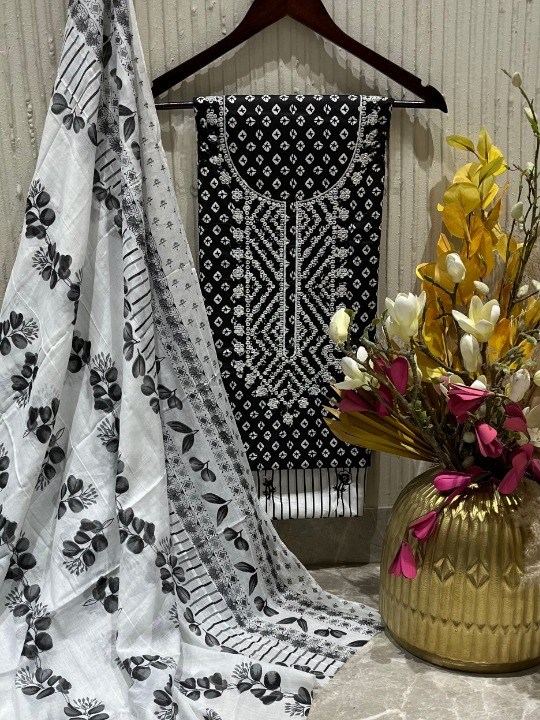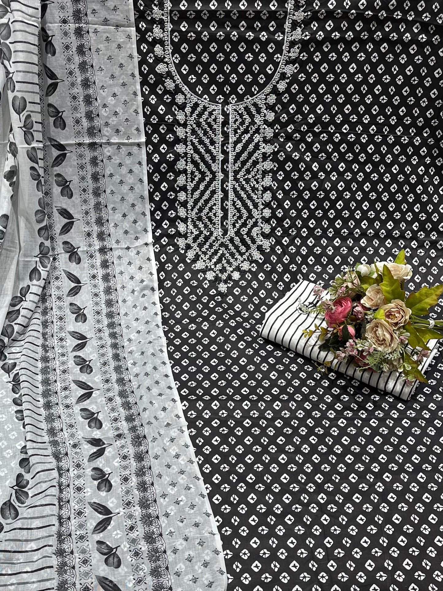 Cotton Embroidered Black & White Unstitched Dress Material With Dupatta