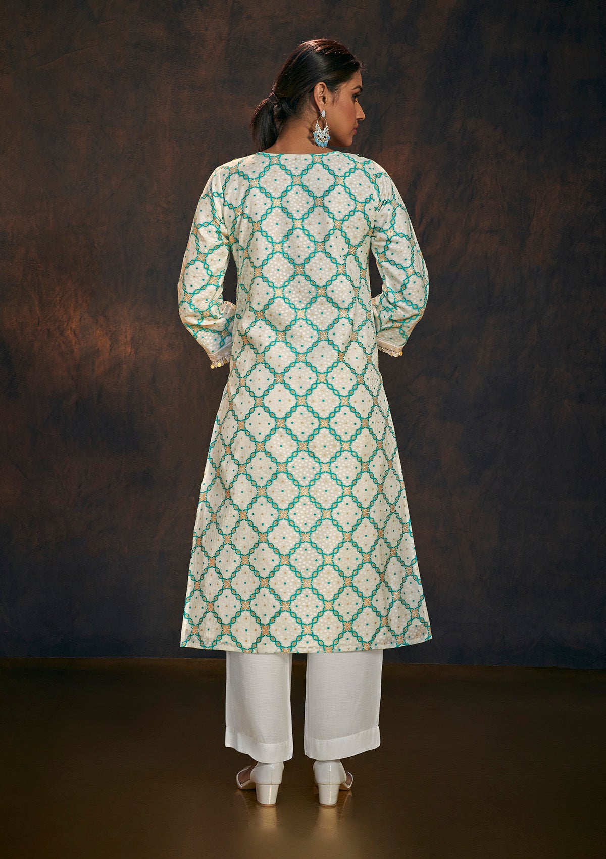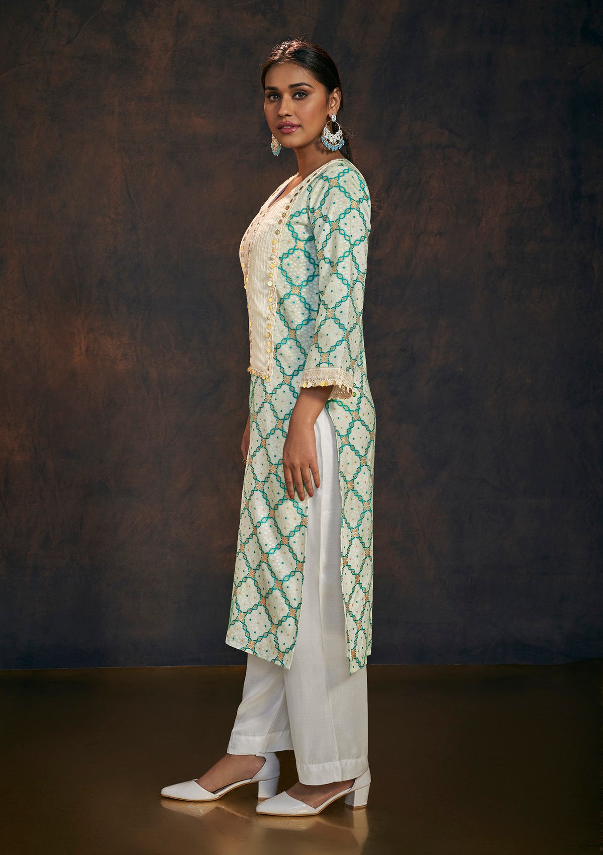 Description: Introducing our Cream & Light Blue Banarasi Chanderi Silk Kurta & Dupatta, crafted with exquisite Banarasi Chanderi silk and adorned with delicate coin lace work on the neckline and body for a touch of sophistication.
