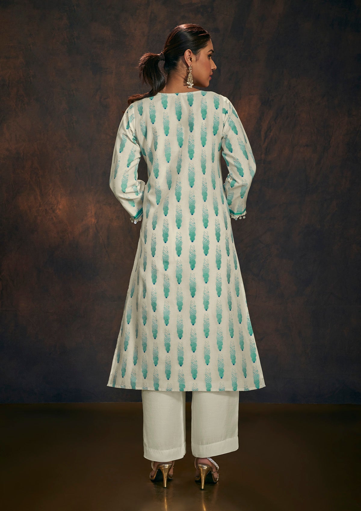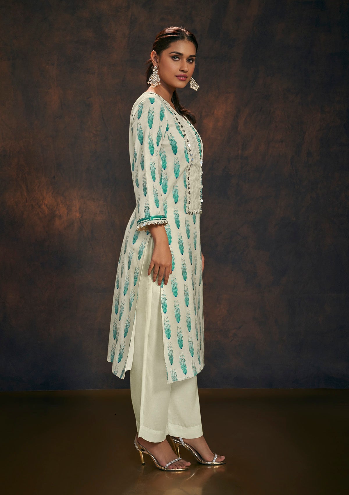 Description: Introducing our Cream & turquoise Banarasi Chanderi Silk Kurta & Dupatta, crafted with exquisite Banarasi Chanderi silk and adorned with delicate coin lace work on the neckline and body for a touch of sophistication.