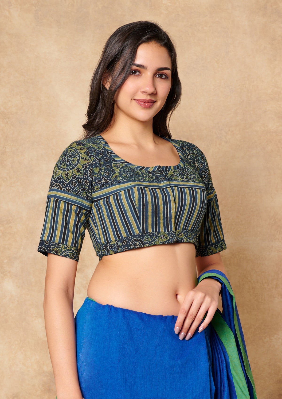 Green Hand Block Printed Ajrakh Pure Cotton Round Neck Readymade Blouse