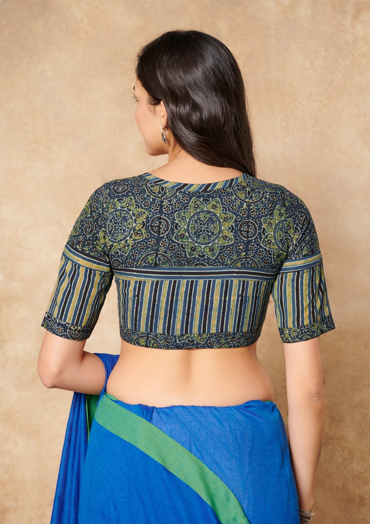 Description - Crafted from sustainable, breathable, natural-dyed pure cotton, this Ajrakh blouse showcases a beautiful floral and striped design. The traditional hand block technique adds a heritage touch, making it a unique statement piece. Designed with a round neckline and elbow-length sleeves, this blouse is perfect for cultural events, casual outings, and festive occasions.