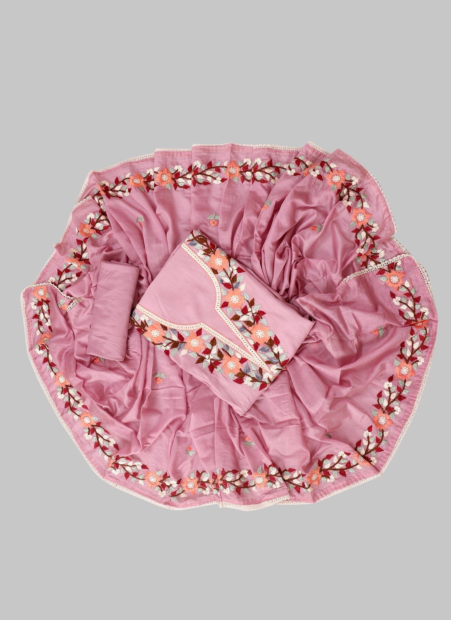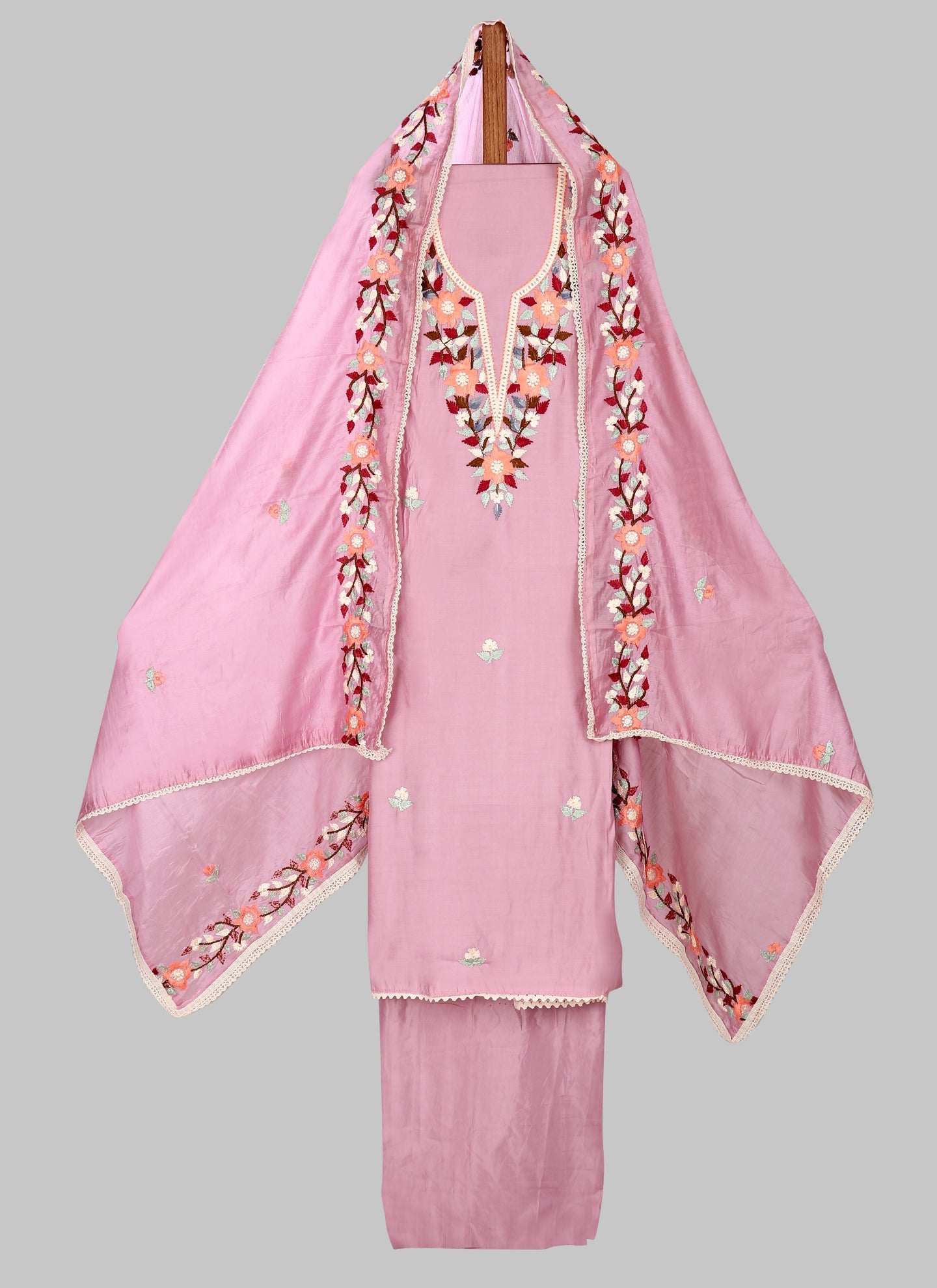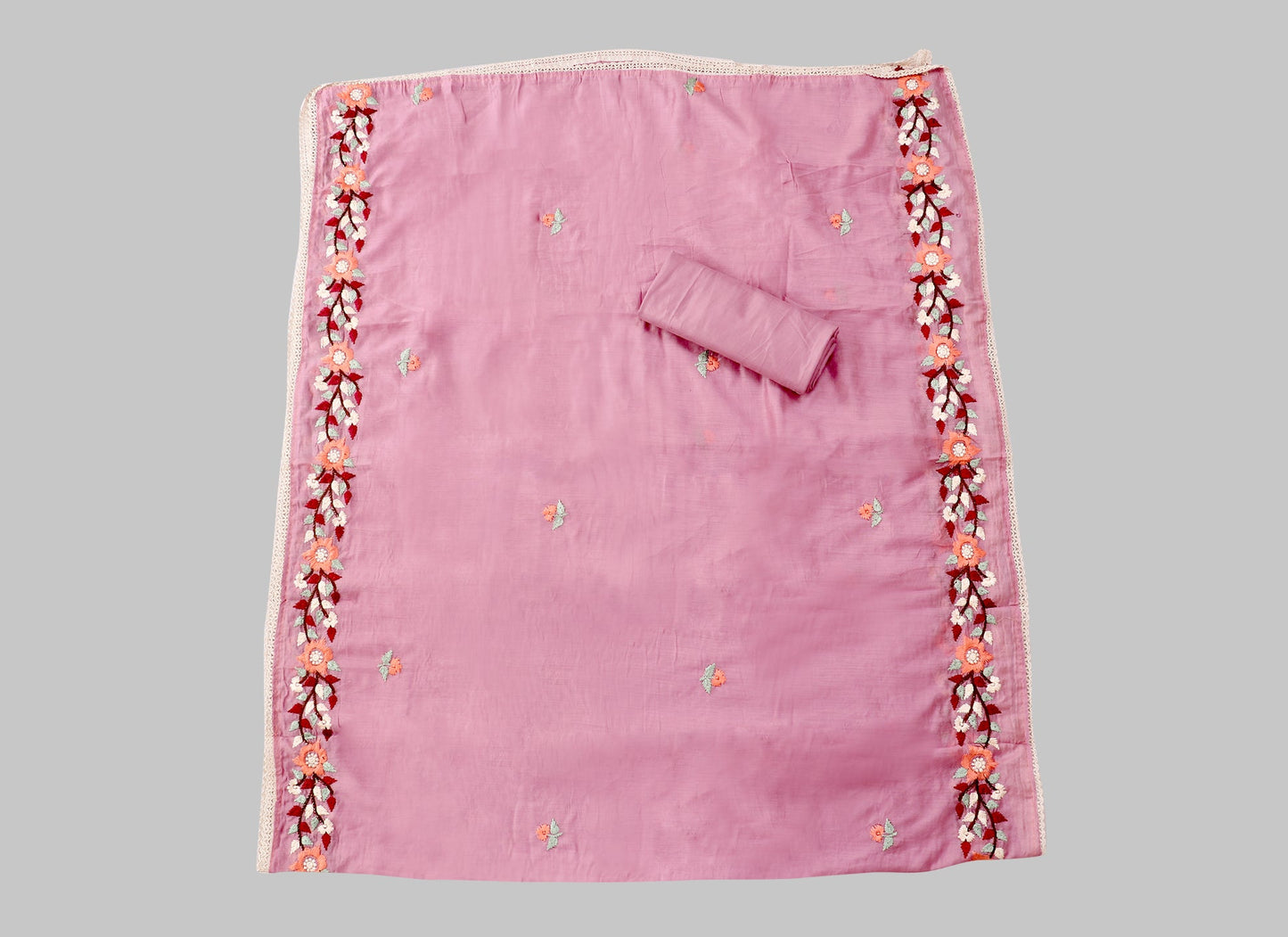 Silk Embroidered Pink Unstitched Dress Material With Dupatta