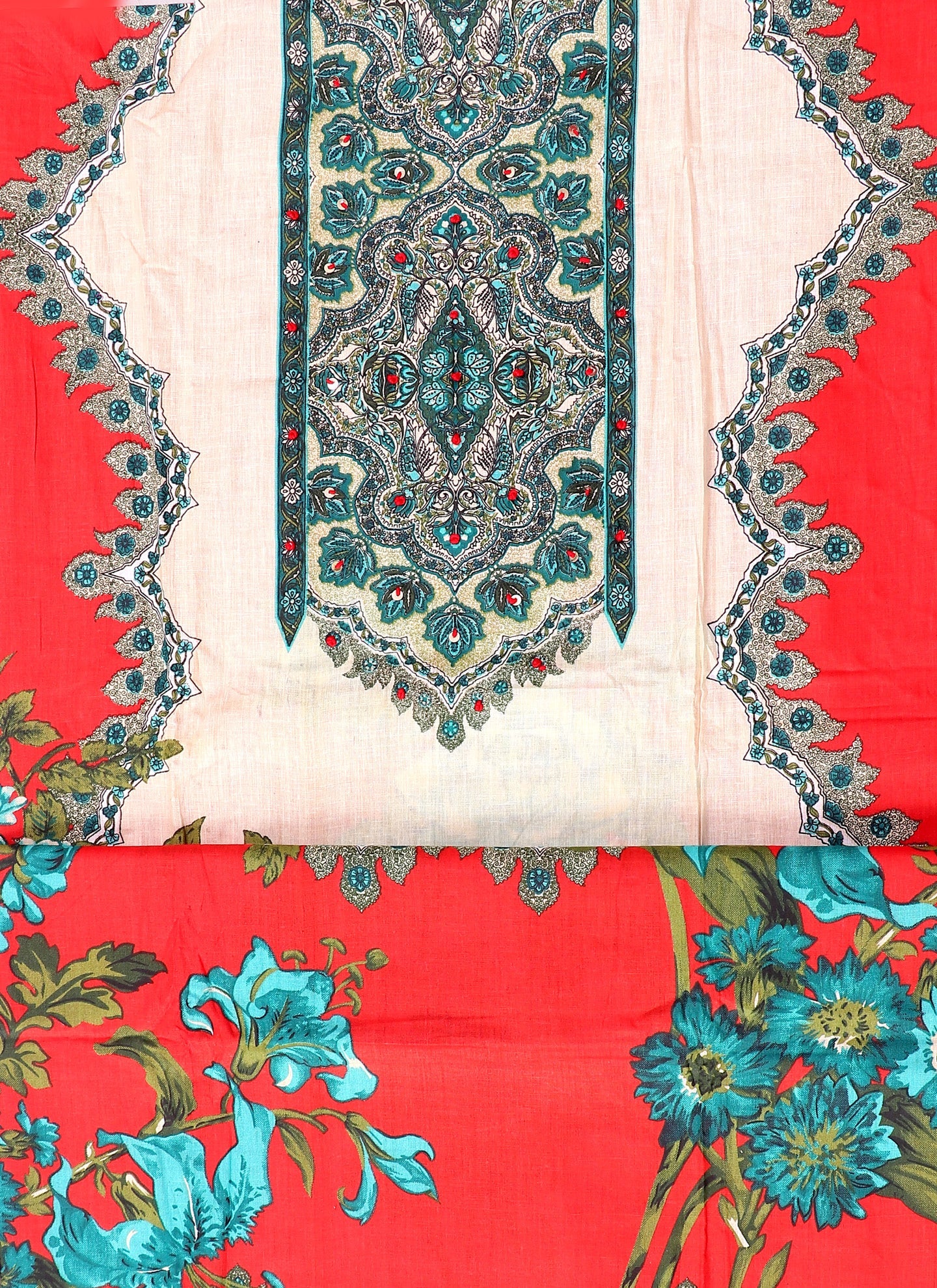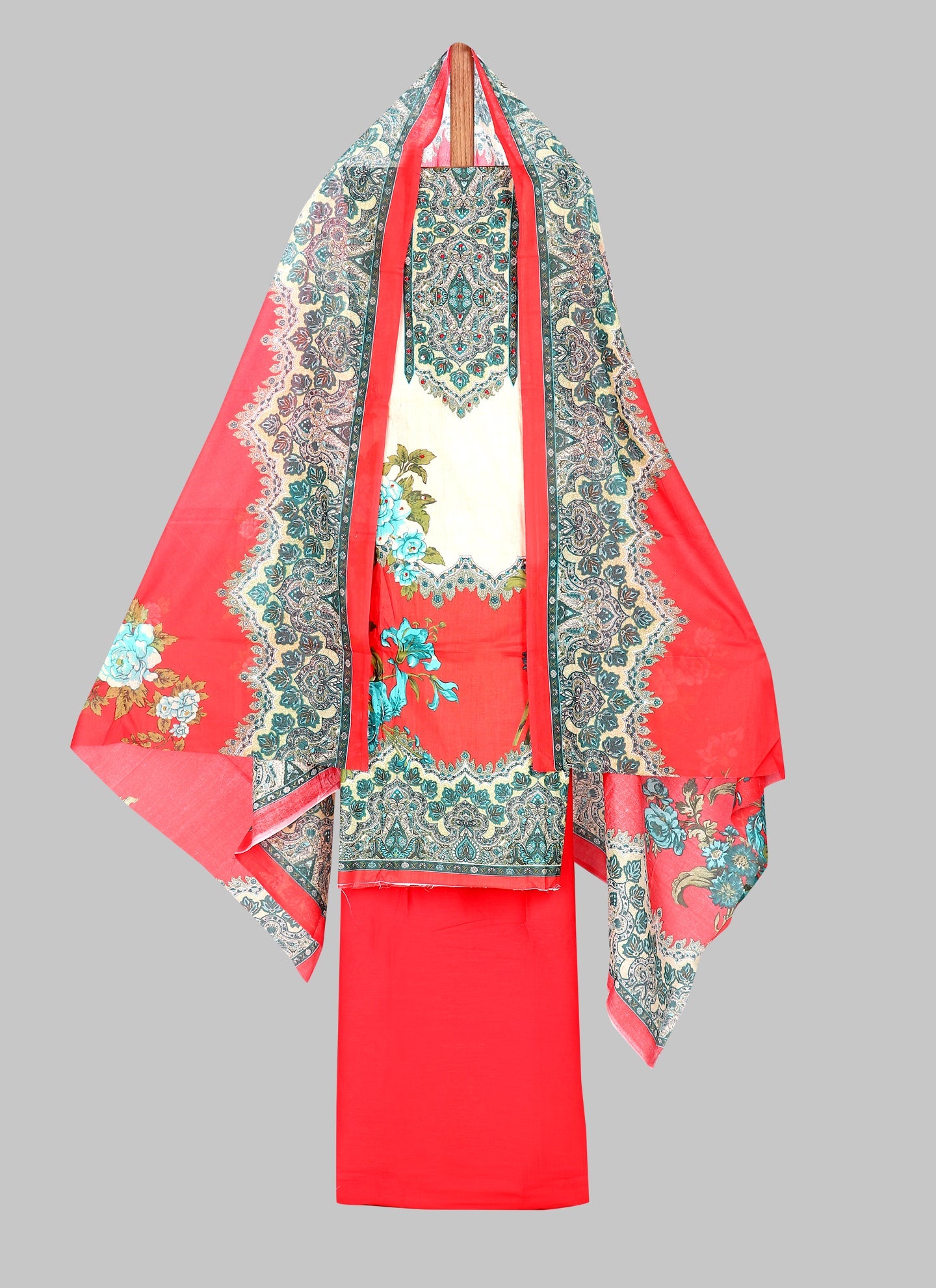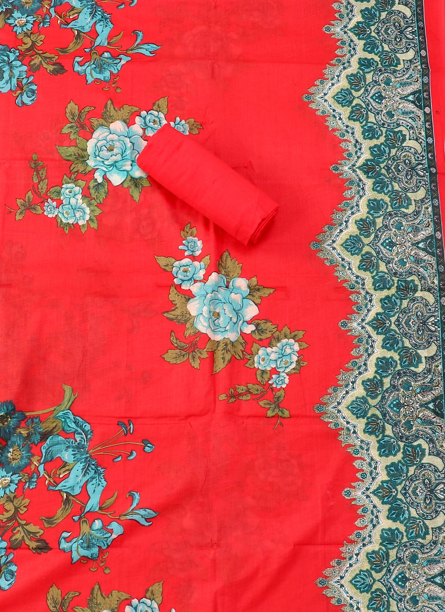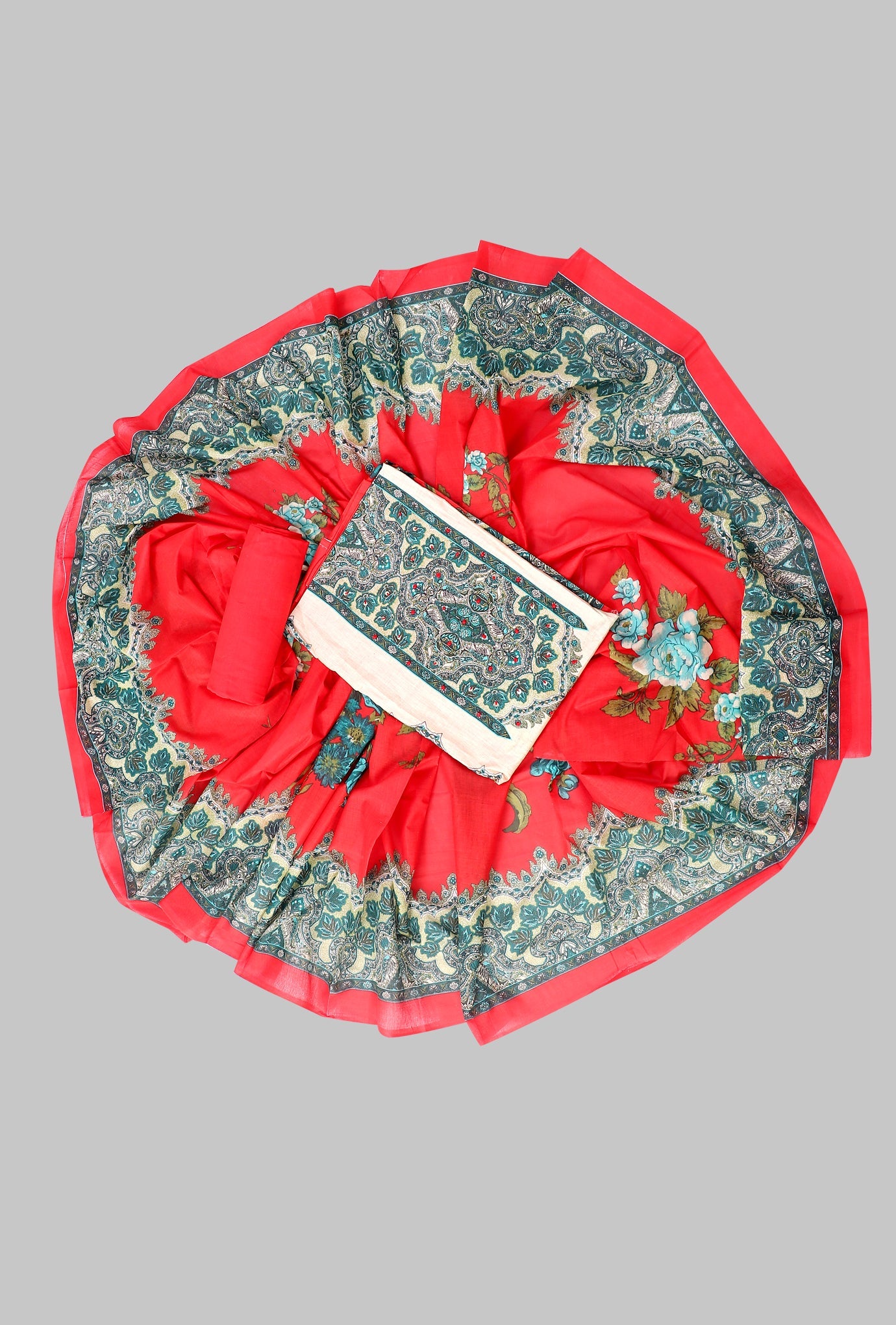 Cotton Printed Red & White Unstitched Dress Material With Dupatta