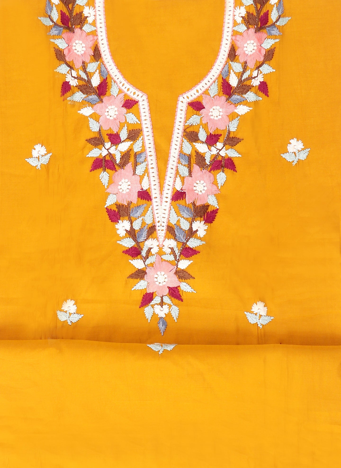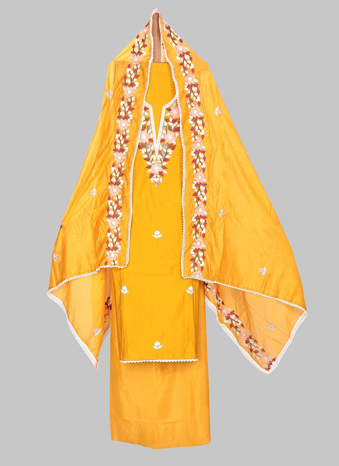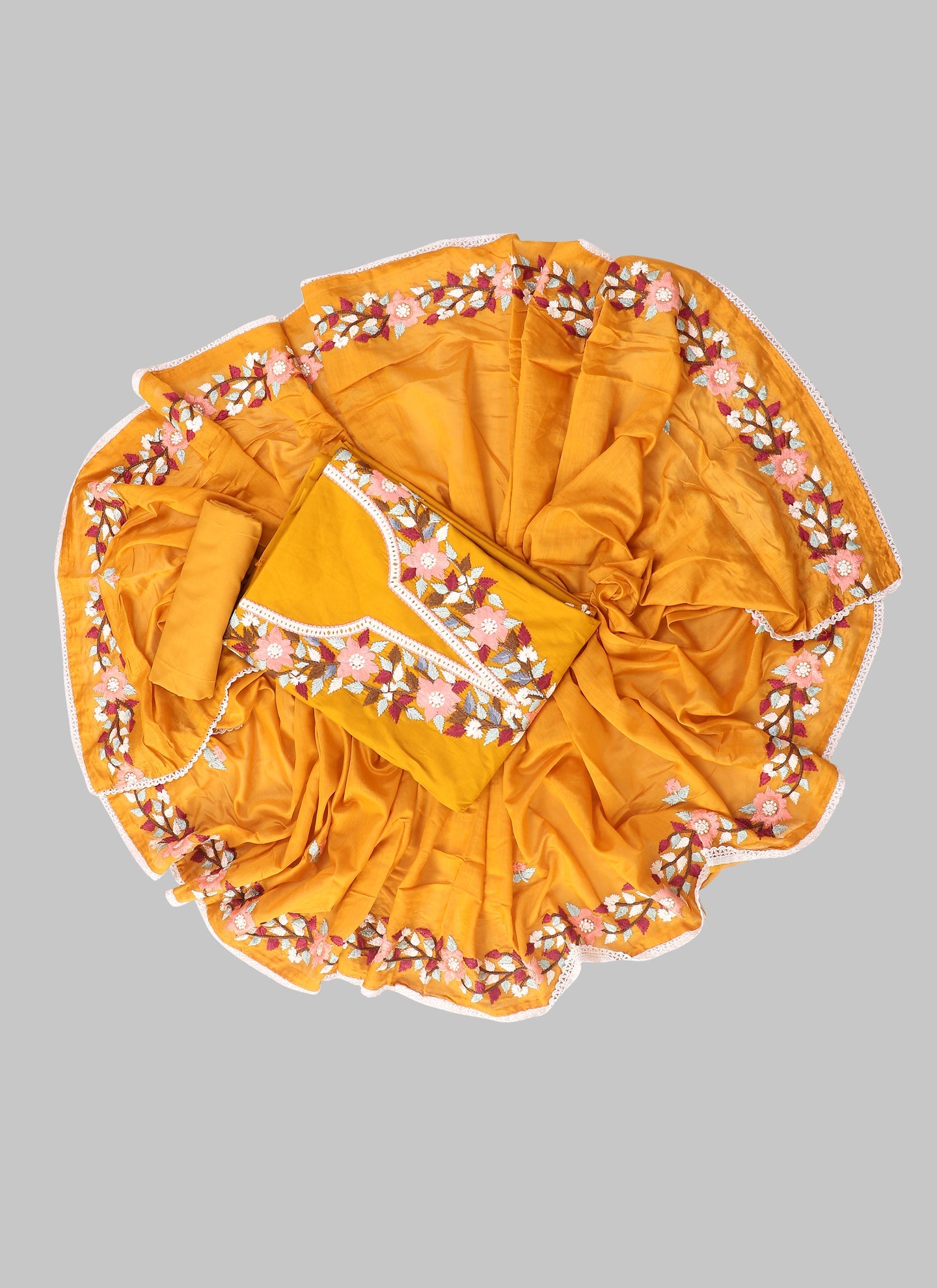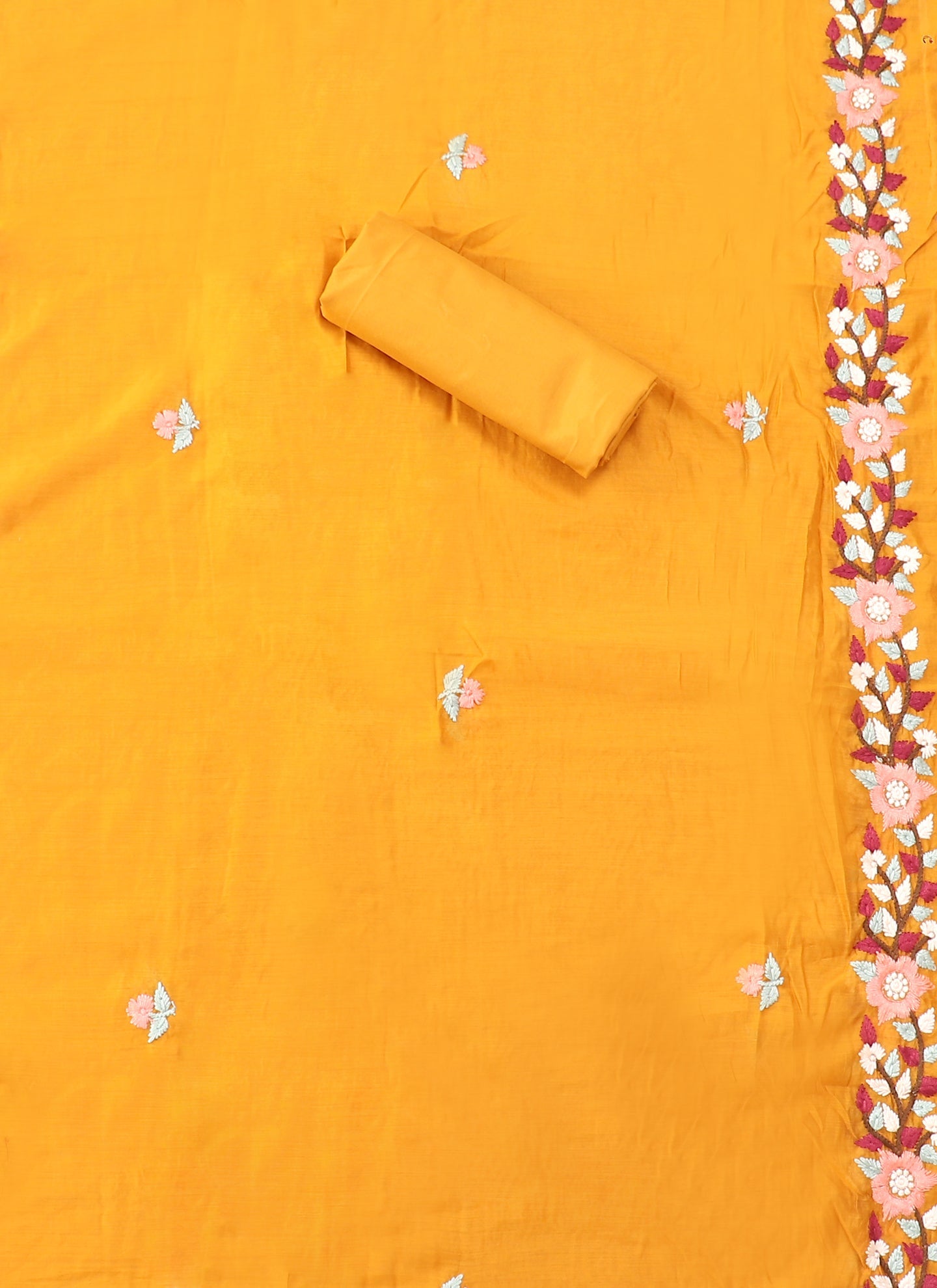 Details: This stunning mustard silk unstitched dress material is the perfect to showcase your sartorial flair. The thread embroidery adds a touch of elegance, it includes top, bottom and dupatta.