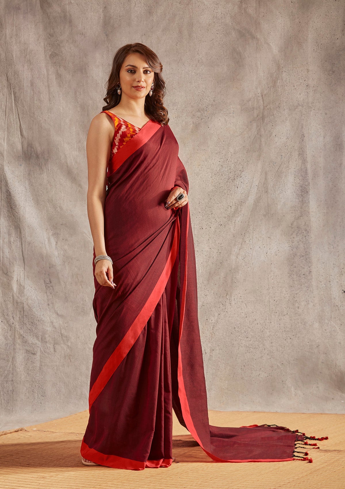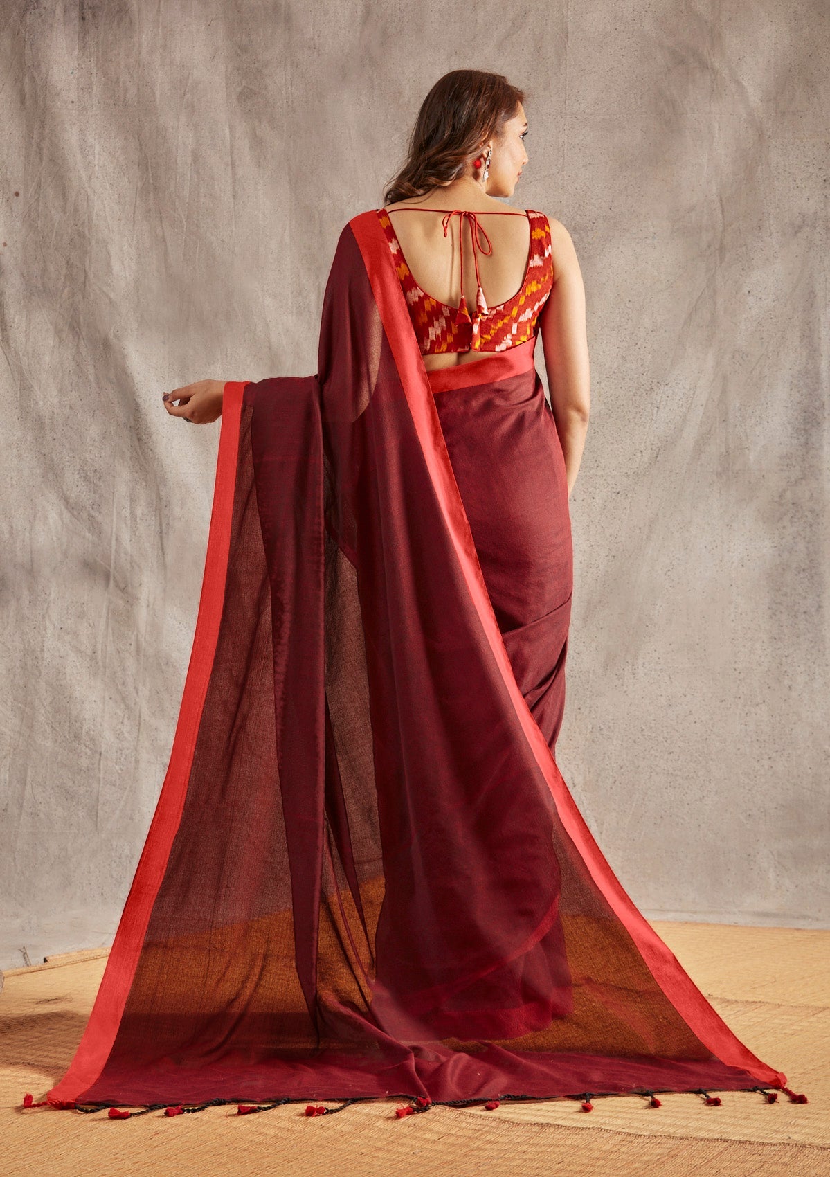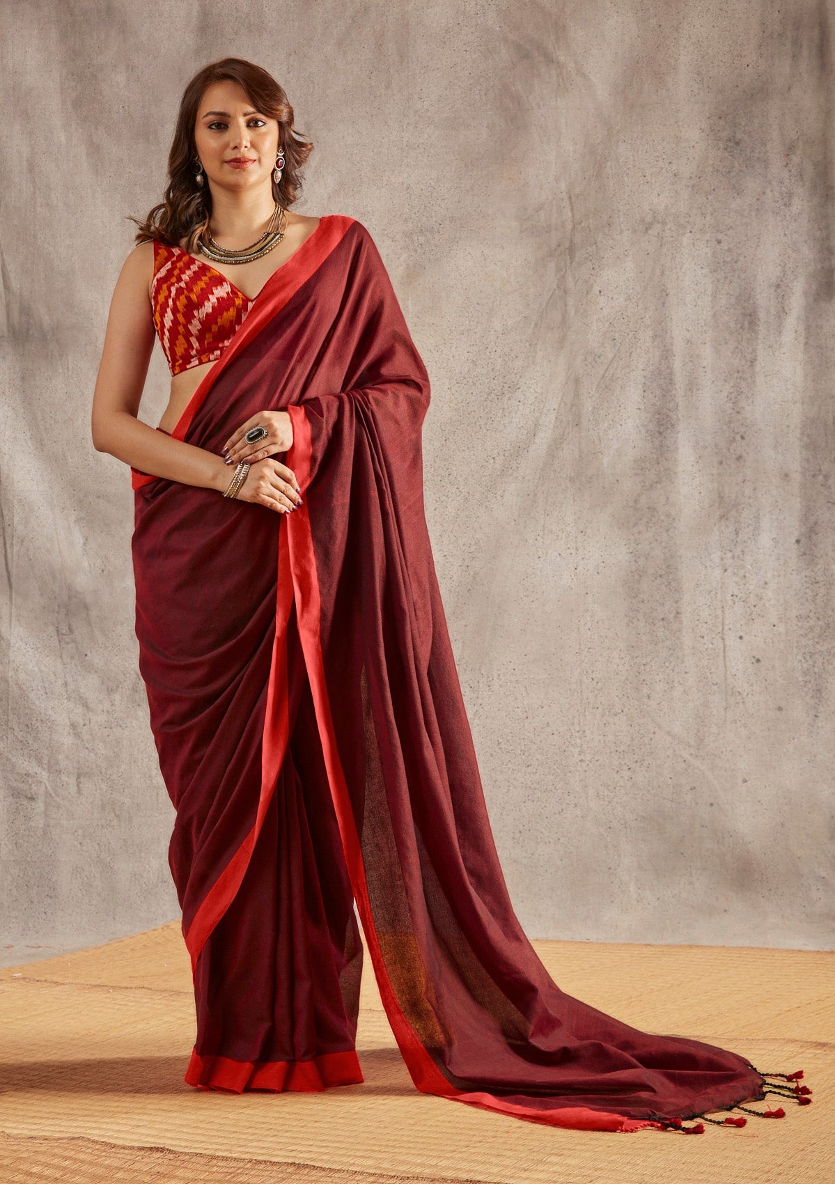 Description: The vibrant red hue of this solid saree which is crafted from premium quality of cotton fabric, the pallu had tassels details to adding more charm in saree. Woman can go for it as a special event or every day casuals.