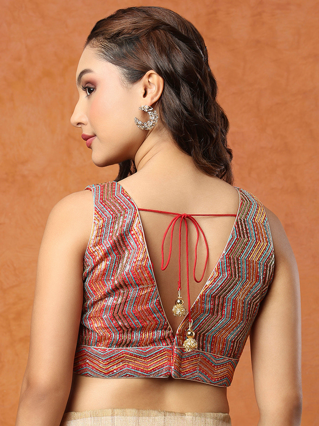 Description : Make a vibrant style statement with this stunning sleeveless V-neck padded blouse. Showcasing a striking blue multicoloured zig-zag pattern, this piece is beautifully crafted with intricate thread and zari embroidery, adding rich texture and visual charm. The unique yoke detail at the waist enhances the silhouette, offering a flattering and tailored fit. Designed with a secure back hook-and-eye closure and elegant tie-up details, this blouse blends comfort with contemporary elegance.