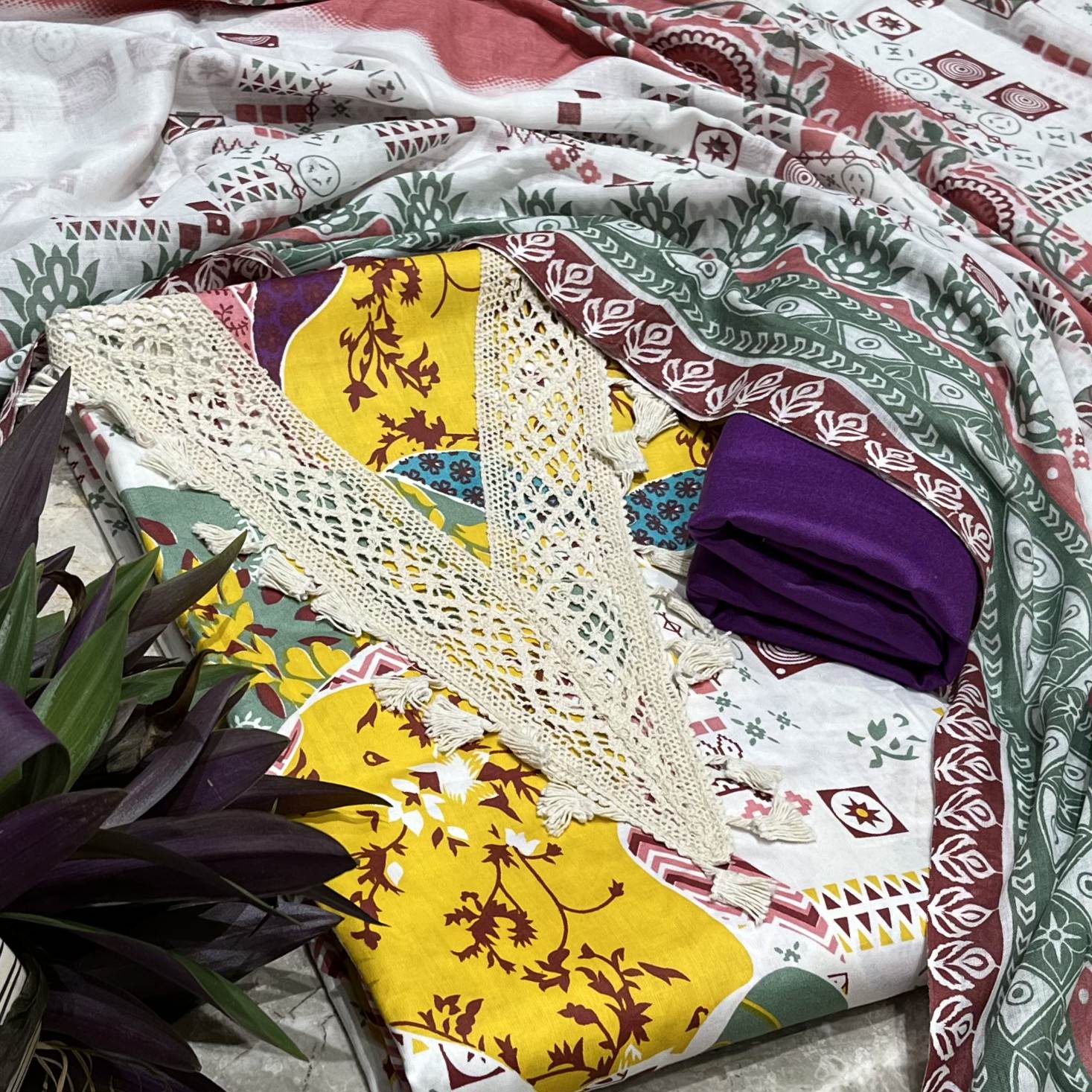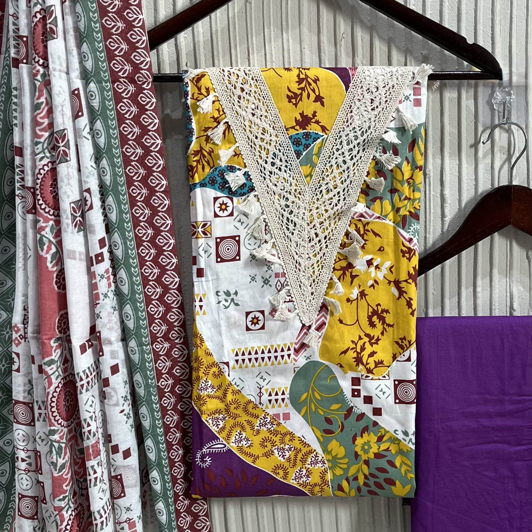 Description : Enhance your everyday ethnic wardrobe with this elegant cotton printed unstitched dress material, Crafted from soft, breathable cotton fabric, the kurta features attractive prints that create a fresh and graceful look, while the delicate lace detailing at the neckline adds a subtle touch of sophistication. The set is paired with a solid bottom along with a beautifully printed dupatta to complete the ensemble. Being unstitched, this dress material gives you the freedom to tailor it to your preferred fit and style.